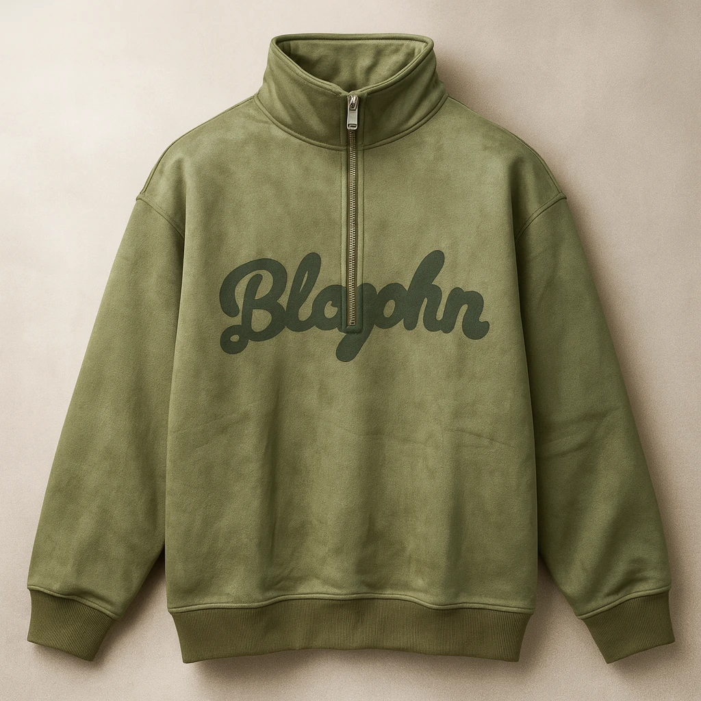 يتميز بياقة مرتفعة وسحاب نصفي يسهّل الارتداء، مع كتابة بارزة على الصدر بلون زيتي داكن تضيف لمسة شبابية مميزة.