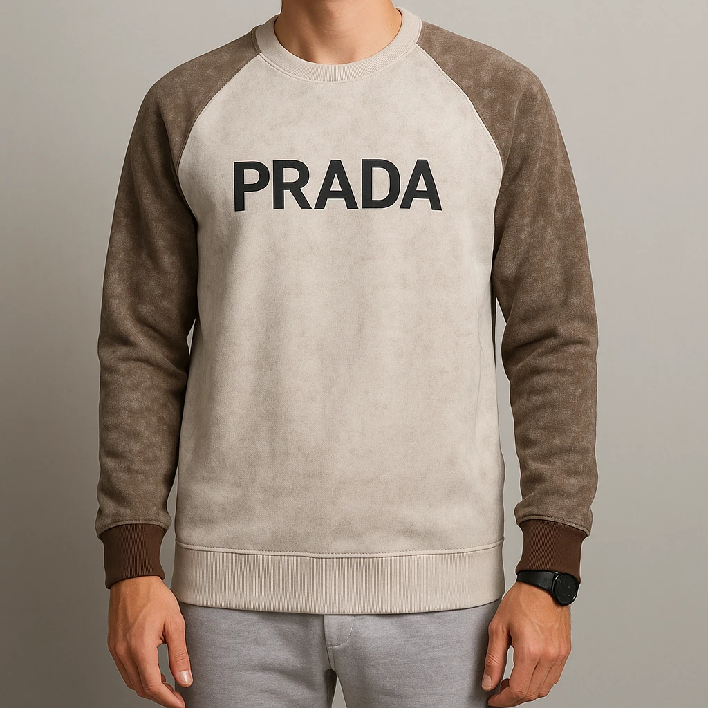 سويت شيرت سكوباليغرا PRADA بلون بيج مع أكمام بنية ناعمة، تصميم عصري يمنحك إطلالة أنيقة ومريحة تناسب الأيام الكاجوال والشتوية.