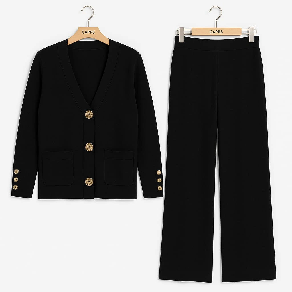 ترينغ نسائي أنيق من الصوف بنسبة ٩٠٪ باللون الأسود الكلاسيكي، يجمع بين الفخامة والبساطة في تصميم واحد. يتميّز الجاكيت بأزرار ذهبية فاخرة تضيف لمسة راقية، مع جيبين أماميين يمنحان مظهراً عملياً وعصرياً، بينما يأتي البنطال بقصّة مستقيمة تمنح راحة وأناقة في الوقت نفسه.