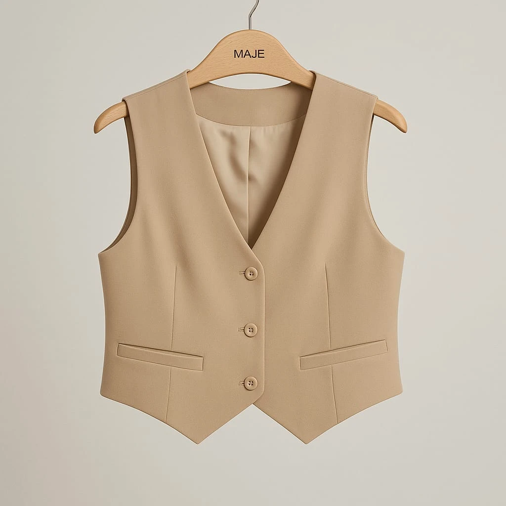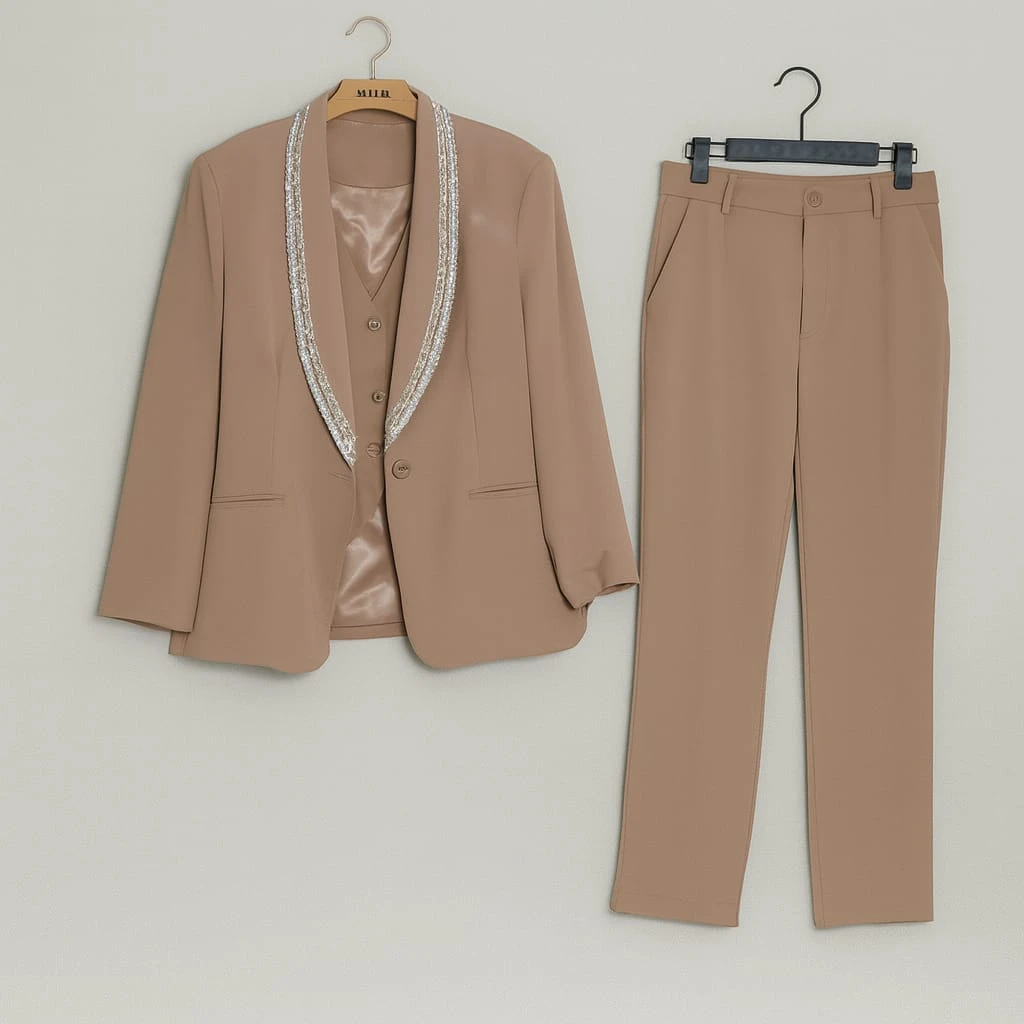 بدلة راقية مكونة من ثلاث قطع: جاكيت، سترة داخلية، وبنطال. مصممة بتفاصيل دانتيل أنيقة للمناسبات الخاصة.