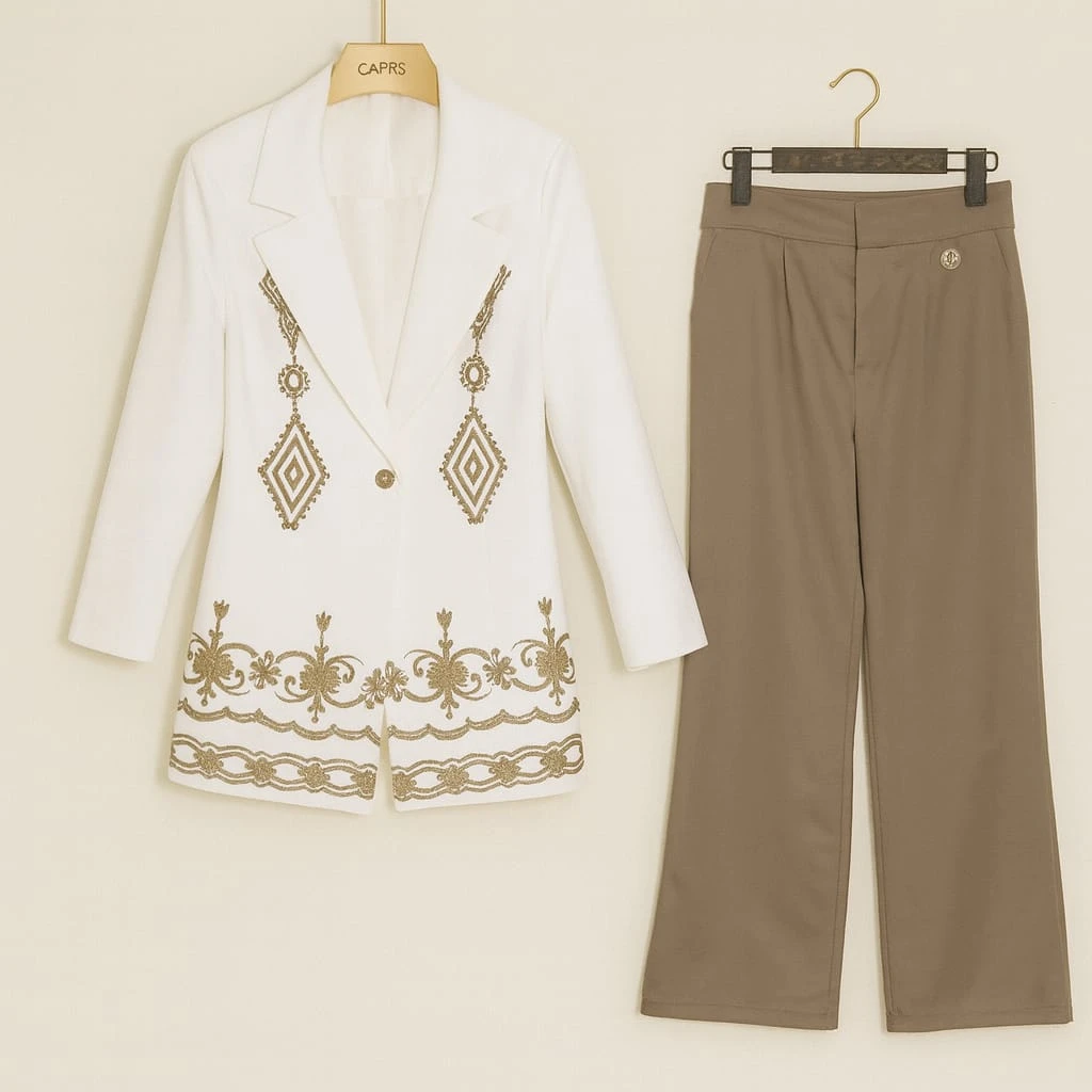 تميّزي بإطلالة راقية مع هذه البدلة النسائية الفاخرة بتصميم يجمع بين الأناقة والبساطة. تتكوّن من جاكيت أبيض مطرّز بتفاصيل ذهبية فنية تضيف لمسة فخامة وأنوثة، مع بنطال بيج بقصّة مستقيمة يمنحك راحة وأناقة في الوقت نفسه. مثالية للإطلالات الرسمية والمناسبات الخاصة، وتمنحك حضورًا مميزًا يعكس ذوقك الرفيع.