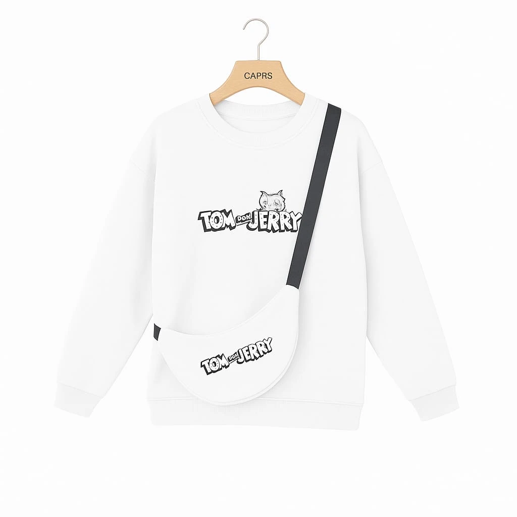 بلوفر أبيض بتصميم Tom & Jerry تصميم بسيط وأنيق لمحبي الكلاسيكية. بلوفر أبيض ناعم بخامة قطن 60% وصوف 40% يمنحك راحة طوال اليوم. مزود بحقيبة جانبية بيضاء بحزام أسود، تحمل نفس الطباعة المرحة لشخصيتي توم وجيري
