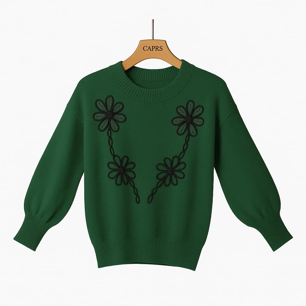 بلوفر نسائي أنيق بلون أخضر زمردي بتطريز بارز على شكل أزهار سوداء يمنحه لمسة أنثوية مميزة. مصنوع من خامة ناعمة ودافئة، بتصميم عصري وأكمام منفوخة تضيف لمسة راقية تناسب الإطلالات الشتوية الكاجوال والأنيقة.