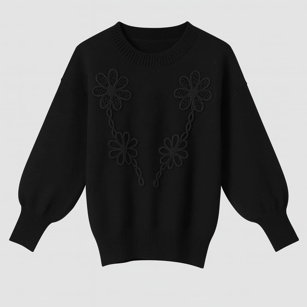 بلوفر نسائي أنيق بلون أسود بتطريز بارز على شكل أزهار يمنحه لمسة أنثوية جذابة. مصنوع من خامة ناعمة ودافئة، بتصميم عصري وأكمام منفوخة تضيف لمسة فخمة مثالية للإطلالات الشتوية الراقية.