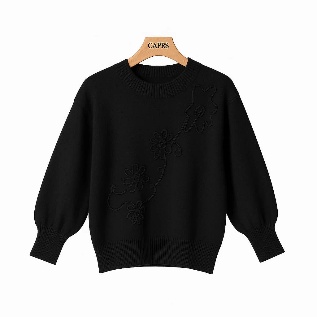 بلوفر نسائي أنيق بلون أسود كلاسيكي بتطريز ناعم على شكل أزهار يمنحه لمسة أنثوية راقية. مصنوع من خامة ناعمة ومريحة بفتحة رقبة دائرية وأكمام منفوخة قليلاً بتصميم عصري يناسب الإطلالات اليومية أو المسائية.