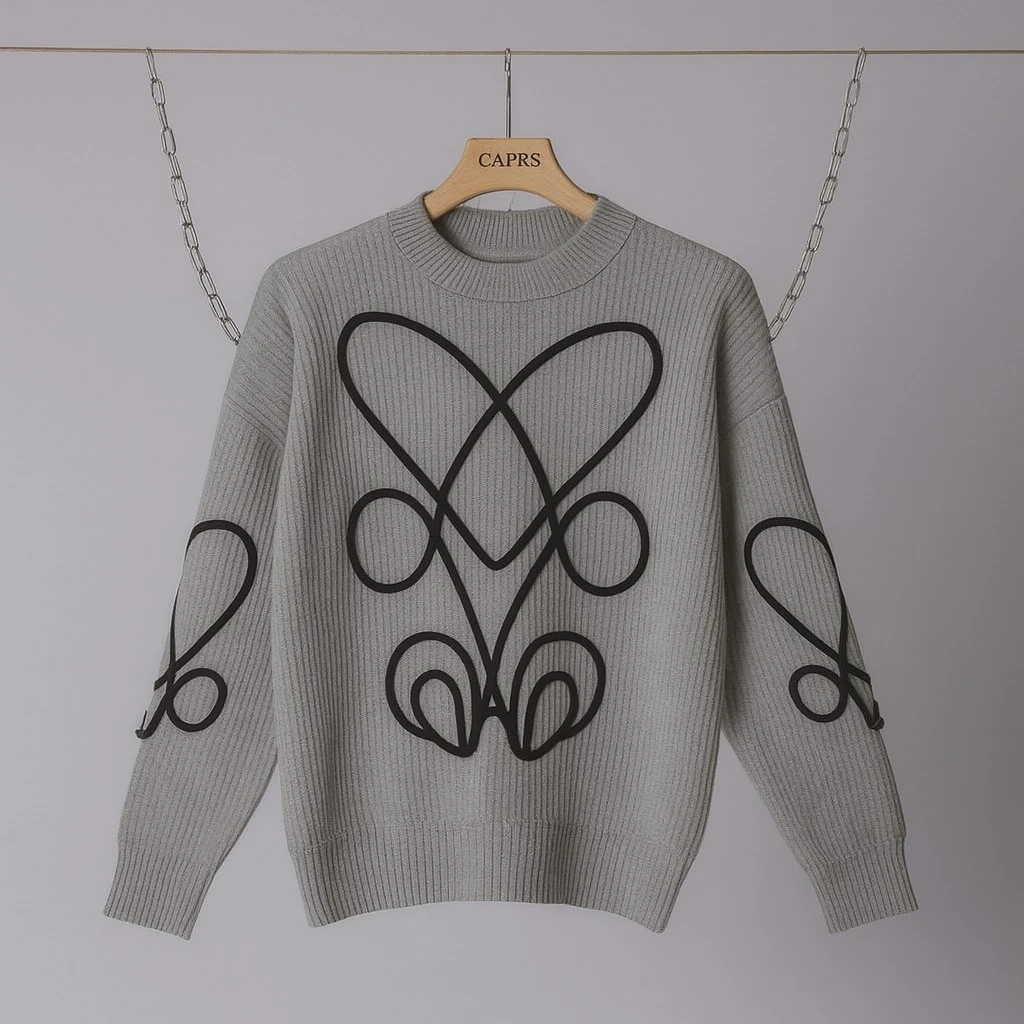 بلوفر نسائي أنيق بلون رمادي بتصميم عصري مزين بخطوط سوداء فنية على الأمام والأكمام. مصنوع من قماش صوفي ناعم يمنحك دفئًا وراحة مع لمسة فخامة تناسب الإطلالات اليومية والشتوية الأنيقة.