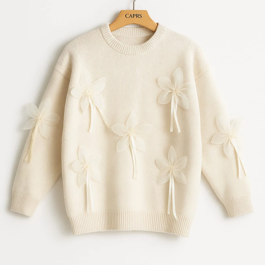 بلوفر نسائي فاخر مصنوع من صوف بنسبة ٩٠٪، باللون الأوف وايت الكلاسيكي الذي يجمع بين النعومة والرقي. يتميّز بتصميم أنثوي مزدان بزهور من الشيفون بلون ناعم متناغم مع القماش، ليمنحك لمسة راقية ومظهرًا فخمًا يناسب كل إطلالة شتوية.