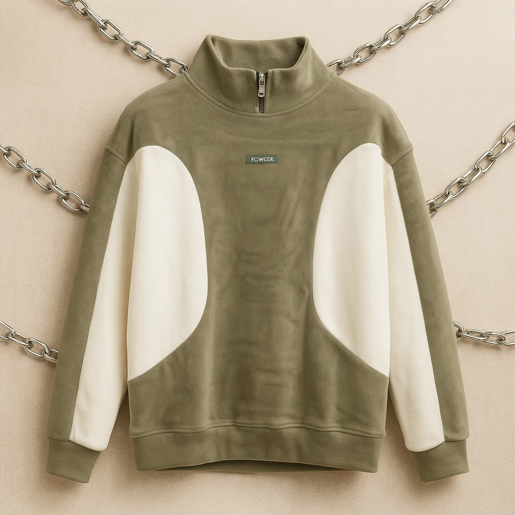 بلوفر شتوي بتصميم عصري بلون زيتي أنيق مع لمسات بيضاء جانبية تمنحه طابعًا شبابيًا مميزًا.