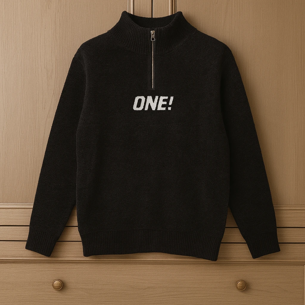 بلوفر صوف ناعم وثقيل ONE! أسود أنيق بتصميم ياقة مرتفعة وسحّاب أمامي قصير، مصنوع من خامة ناعمة ودافئة تمنحك إطلالة شتوية مريحة وعصرية تناسب جميع الإطلالات اليومية.