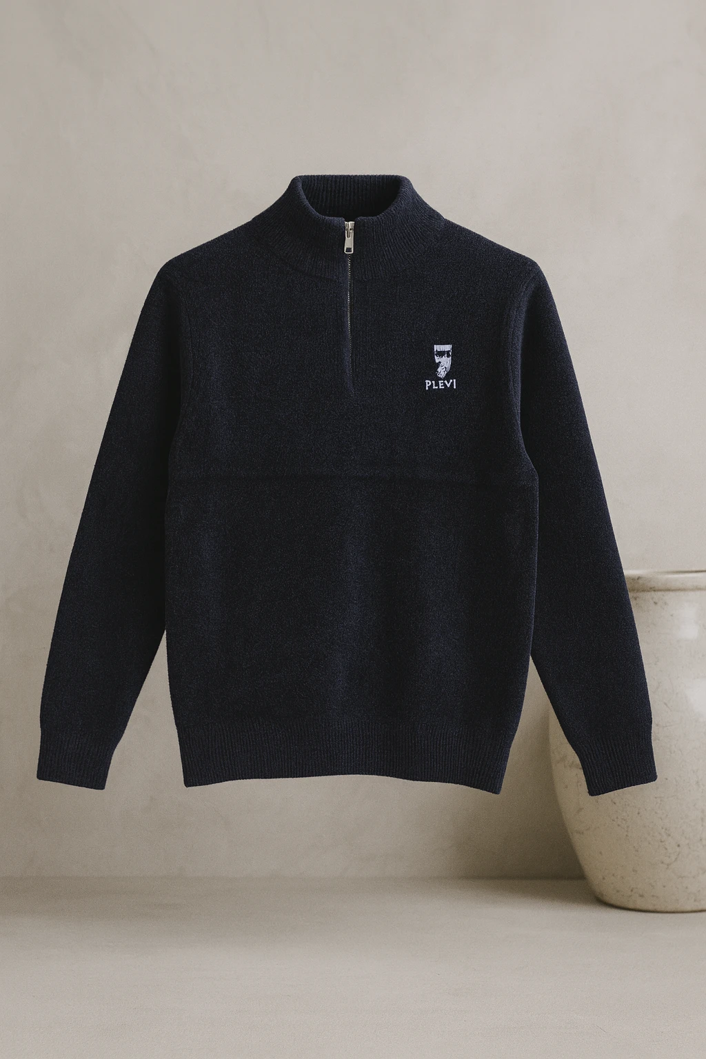 بلوفر صوف ناعم وثقيل PLEVI بلون كحلي أنيق بتصميم ياقة مرتفعة وسحّاب أمامي قصير، مصنوع من خامة دافئة وناعمة تمنحك راحة وأناقة شتوية مثالية للإطلالات اليومية والكاجوال.