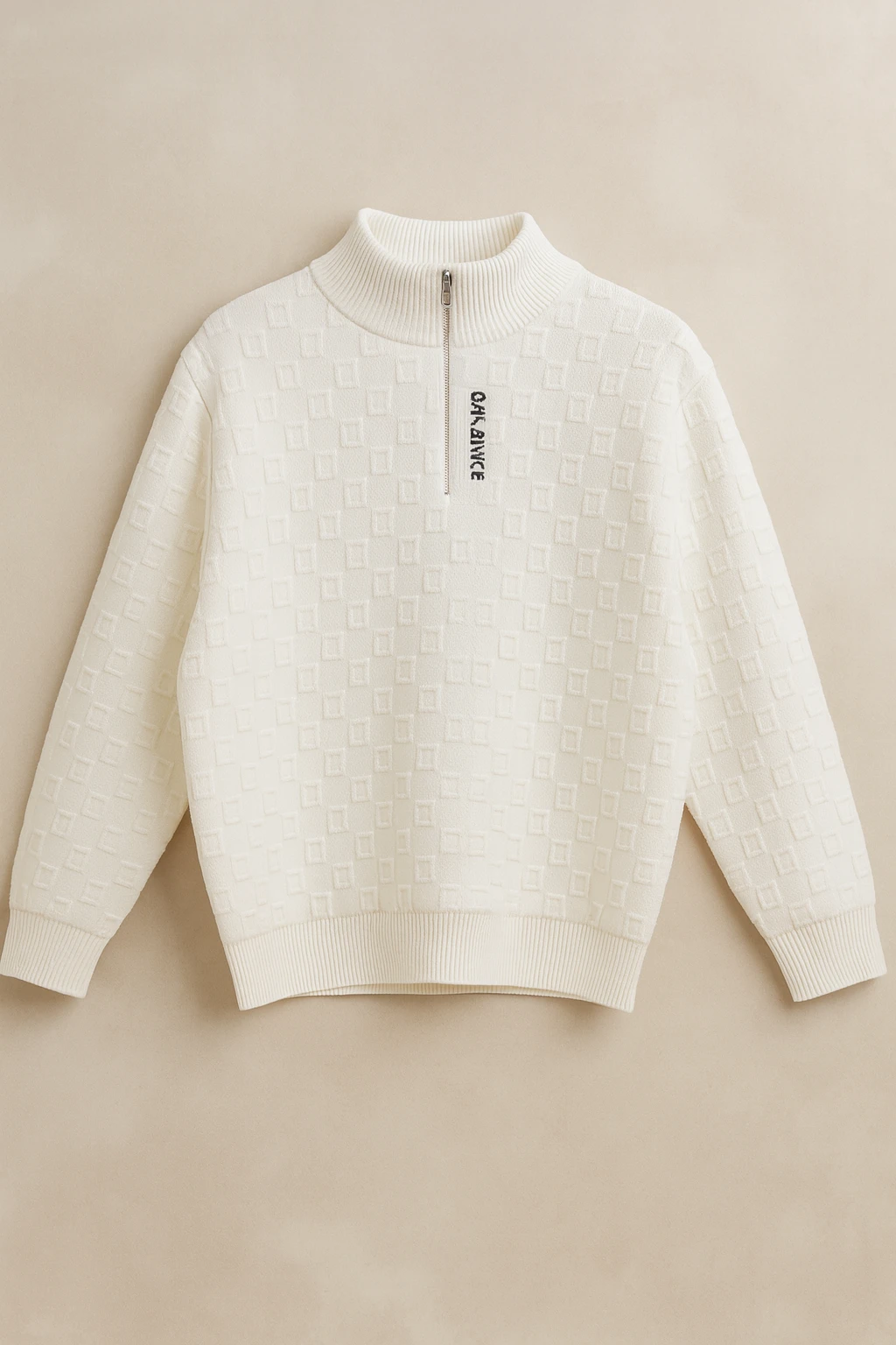 بلوفر صوف ناعم وثقيل QATANICE بلون أبيض أنيق بتصميم ياقة مرتفعة وسحّاب أمامي قصير، يتميّز بنقشة هندسية فاخرة وخامة ناعمة تمنحك دفء وأناقة عصرية تناسب الإطلالات الشتوية الراقية.