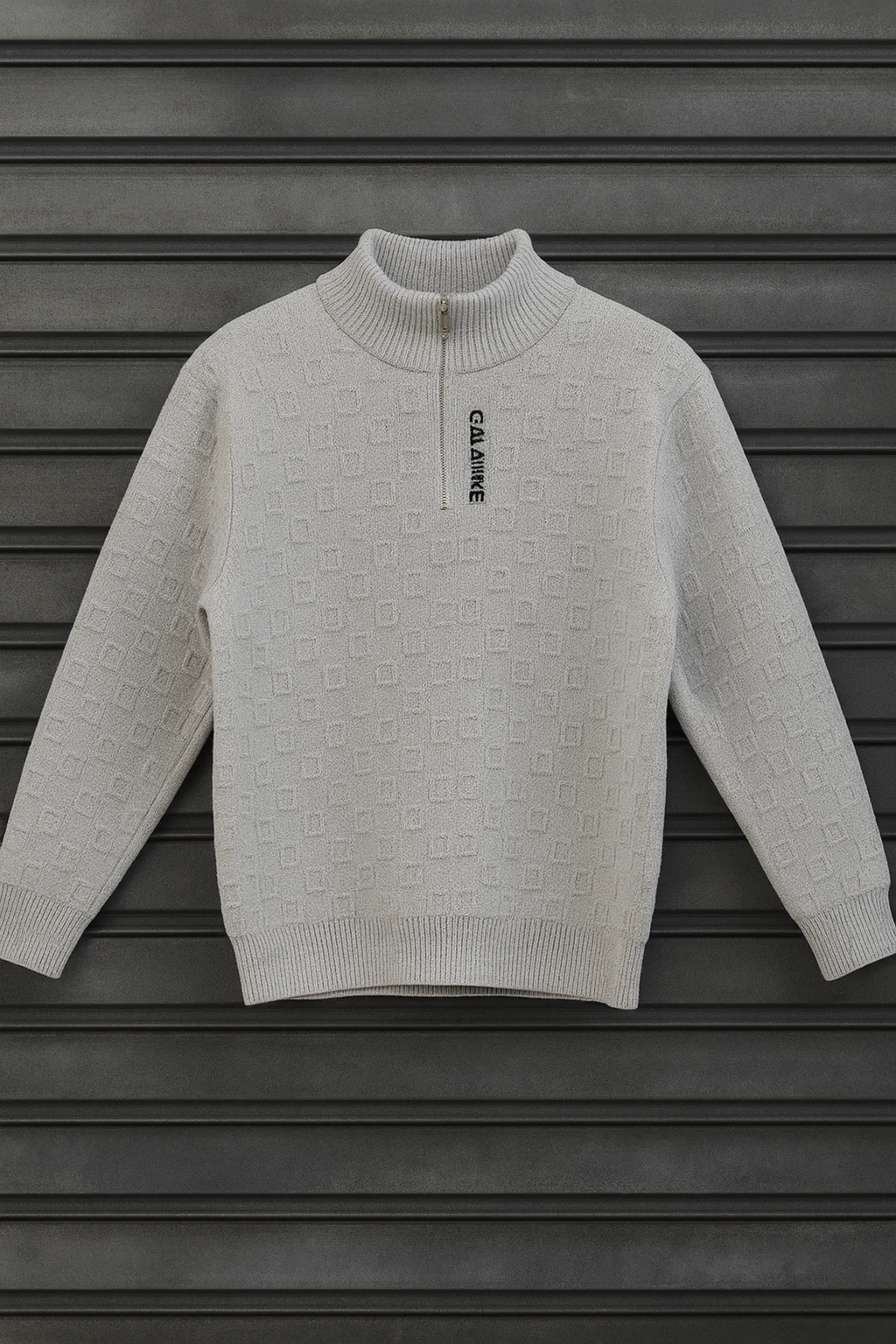 بلوفر صوف ناعم وثقيل QATANICE رمادي فاتح بتصميم ياقة مرتفعة وسحّاب أمامي قصير، يتميّز بنقشة هندسية ناعمة وخامة دافئة تمنحك إطلالة أنيقة ومريحة تناسب الأجواء الباردة.
