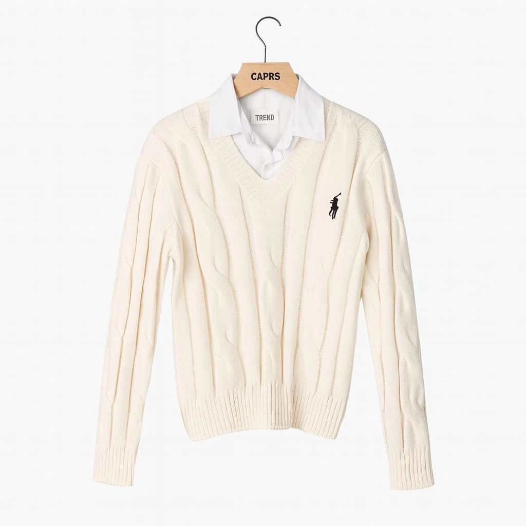 تأتي بتصميم رقبة على شكل V مع قميص أبيض داخلي مدمج لإطلالة متكاملة تجمع بين الأناقة والبساطة، ويزينها شعار بولو المطرّز باللون الأسود على الصدر لإضافة لمسة مميزة.