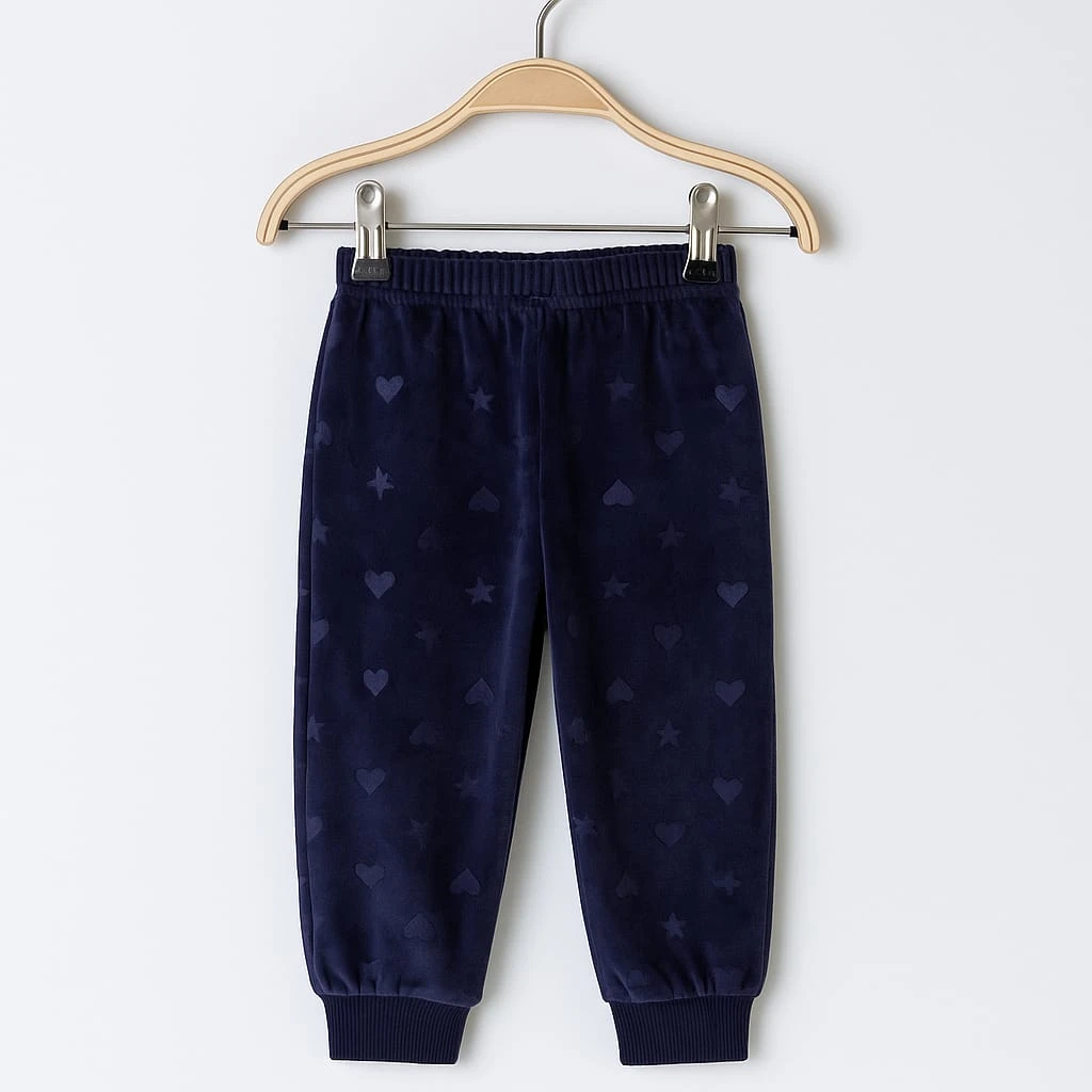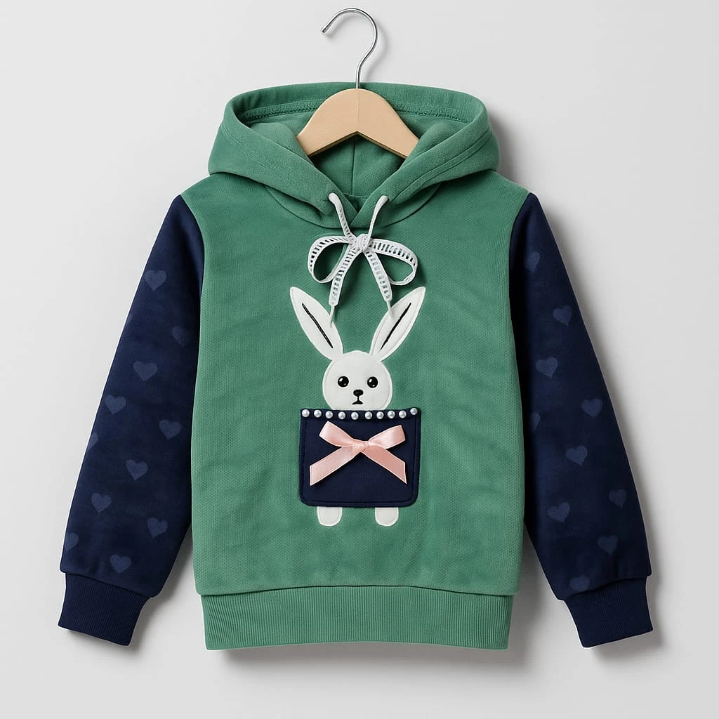 تتألف من هودي مخملي باللون الأخضر برسمة أرنب لطيف وجيب مزين بشريطة زهرية، مع بنطال كحلي بنقوش قلوب ناعمة لتصميم متناسق ومحبب للأطفال.