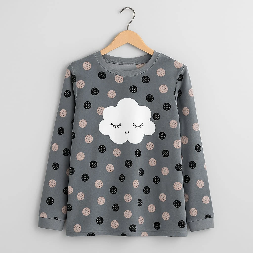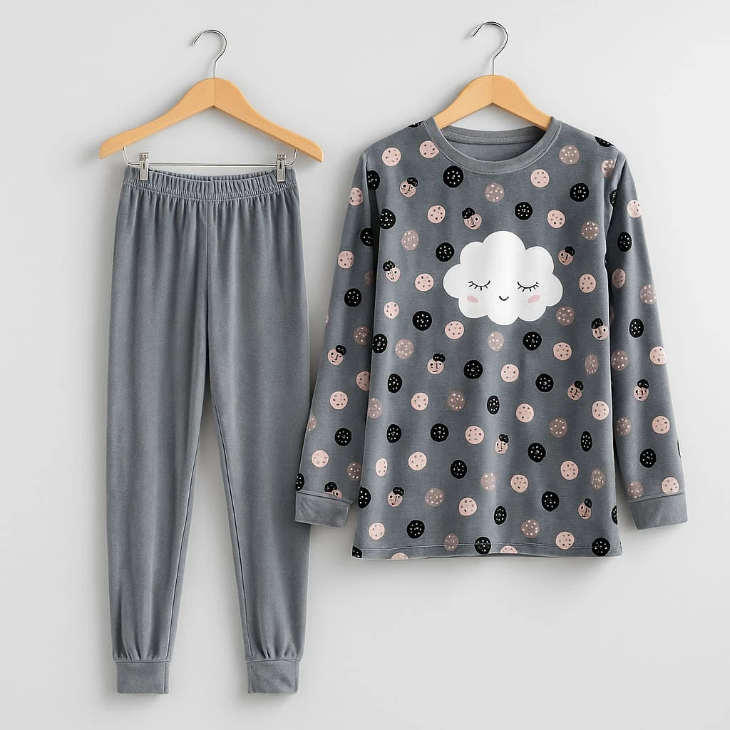بيجامة رمادية برسمة غيمة لطيفة ودوائر مرحة. مصنوعة من قماش ناعم ومريح يمنحك الدفء والراحة في أوقات الاسترخاء أو النوم