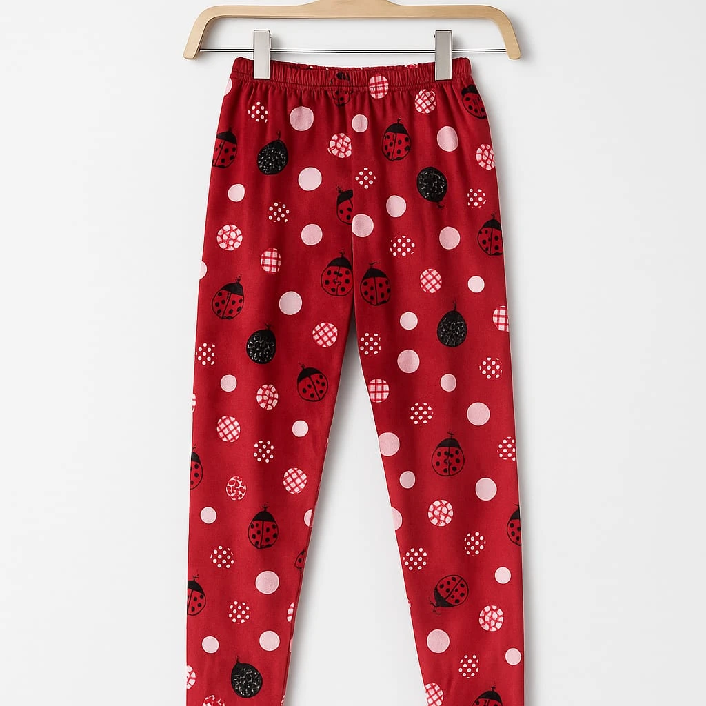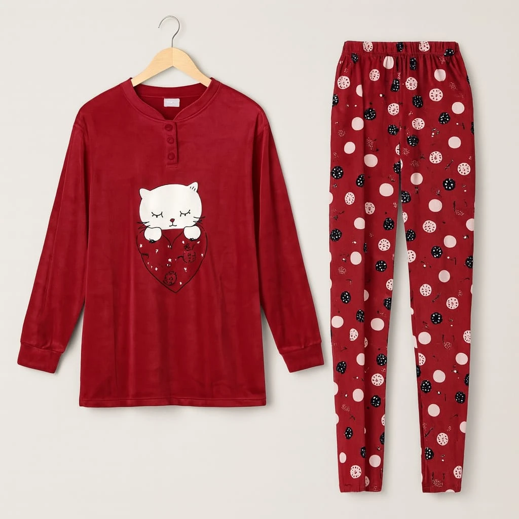 بيجامة بلون خمري جذاب مع تصميم قطة ناعمة على الصدر. القماش مخملي دافئ، والبنطال مزخرف بنقاط مرحة. مثالية للراحة والنوم المريح في الليالي الباردة.