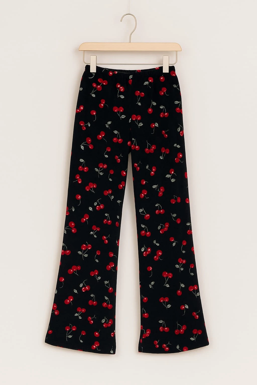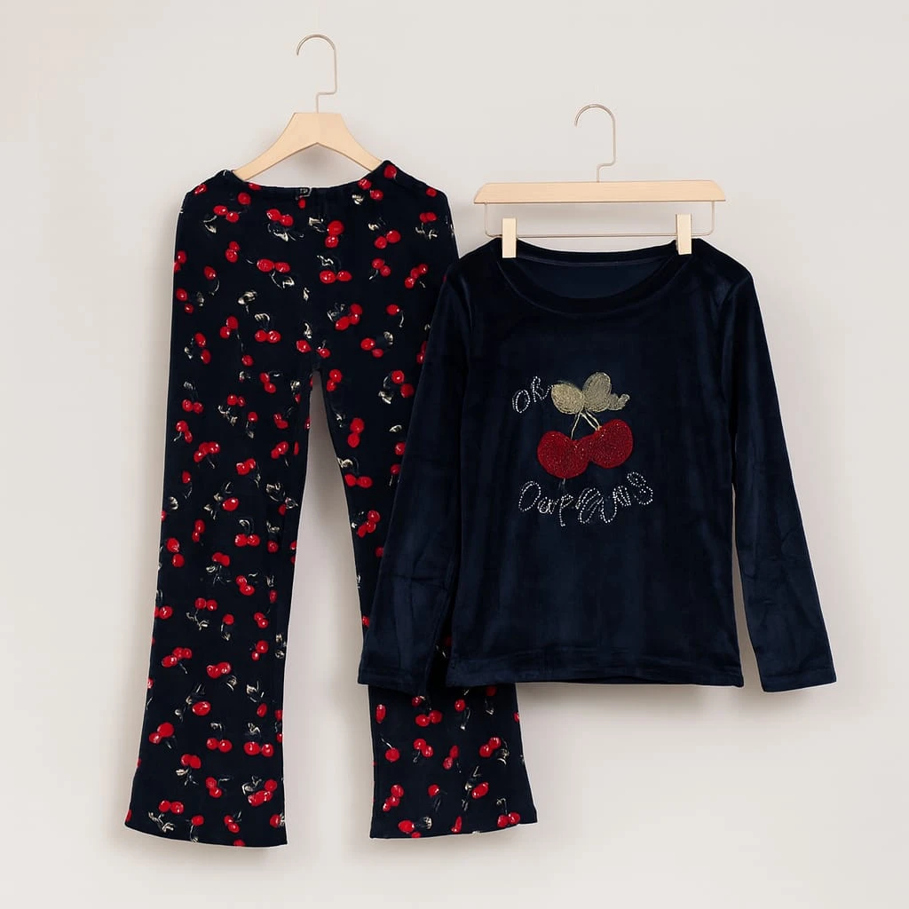 بيجامة ناعمة بلون كحلي مطرز بتفاصيل الكرز اللامعة. تمنحك دفئًا وأناقة في آنٍ واحد، مثالية لليالي الشتوية المريحة.
