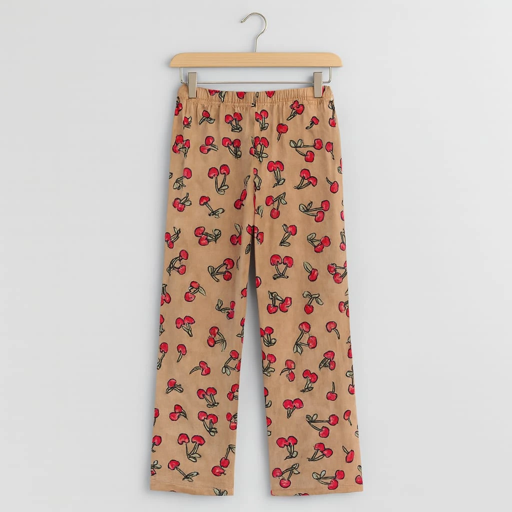 طقم نوم ناعم بلون بيج فاتح مع طبعة كرز أنيقة ولمسة مخملية فاخرة. تمنحك دفئًا وأناقة في آنٍ واحد.
