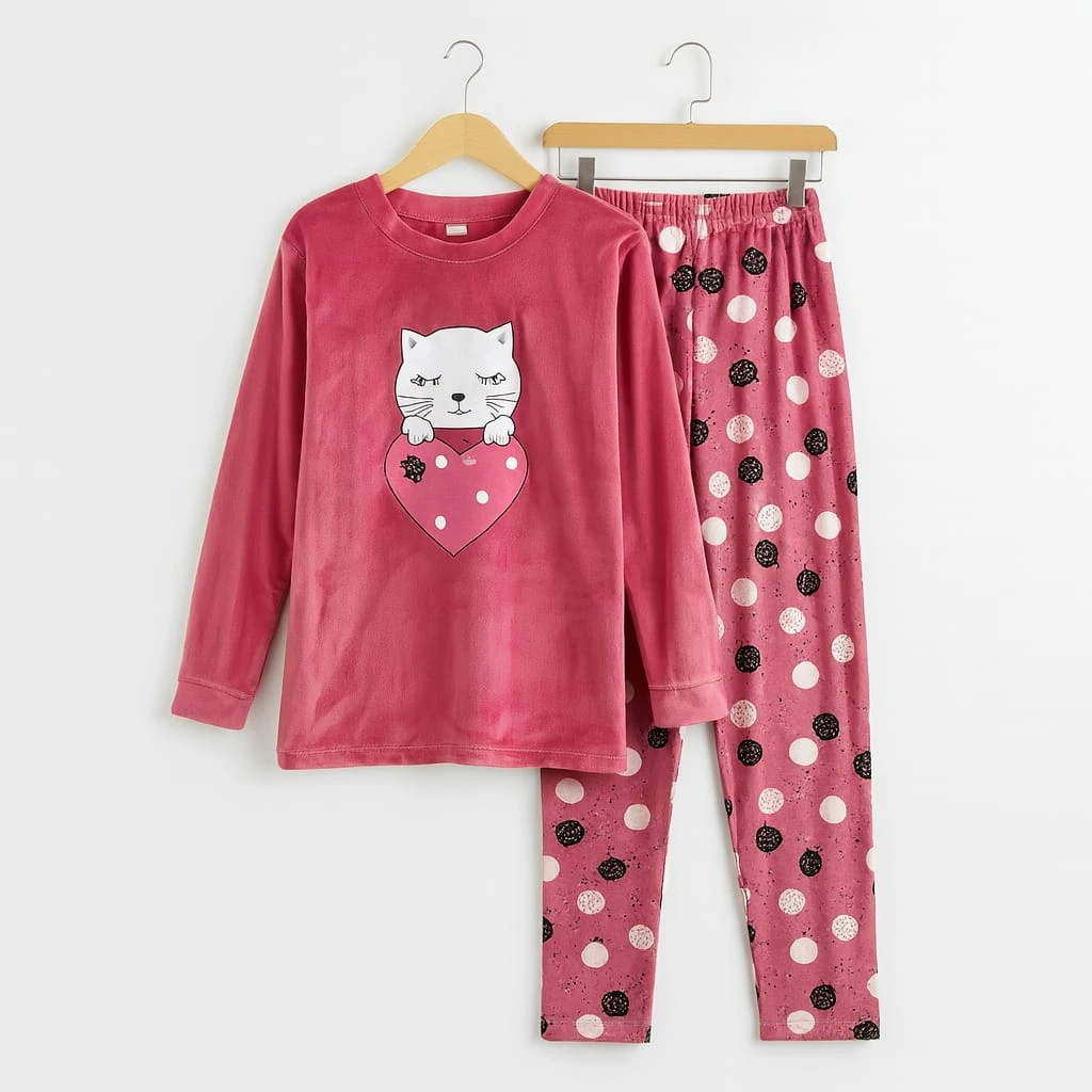 بيجامة نسائية ناعمة باللون الوردي الفاتح، مصنوعة من قماش قطيفة دافئ بلمسة مريحة. تتميز بطبعة قطة لطيفة على القميص وبنطال منقط، لإطلالة منزلية مرحة ومريحة.