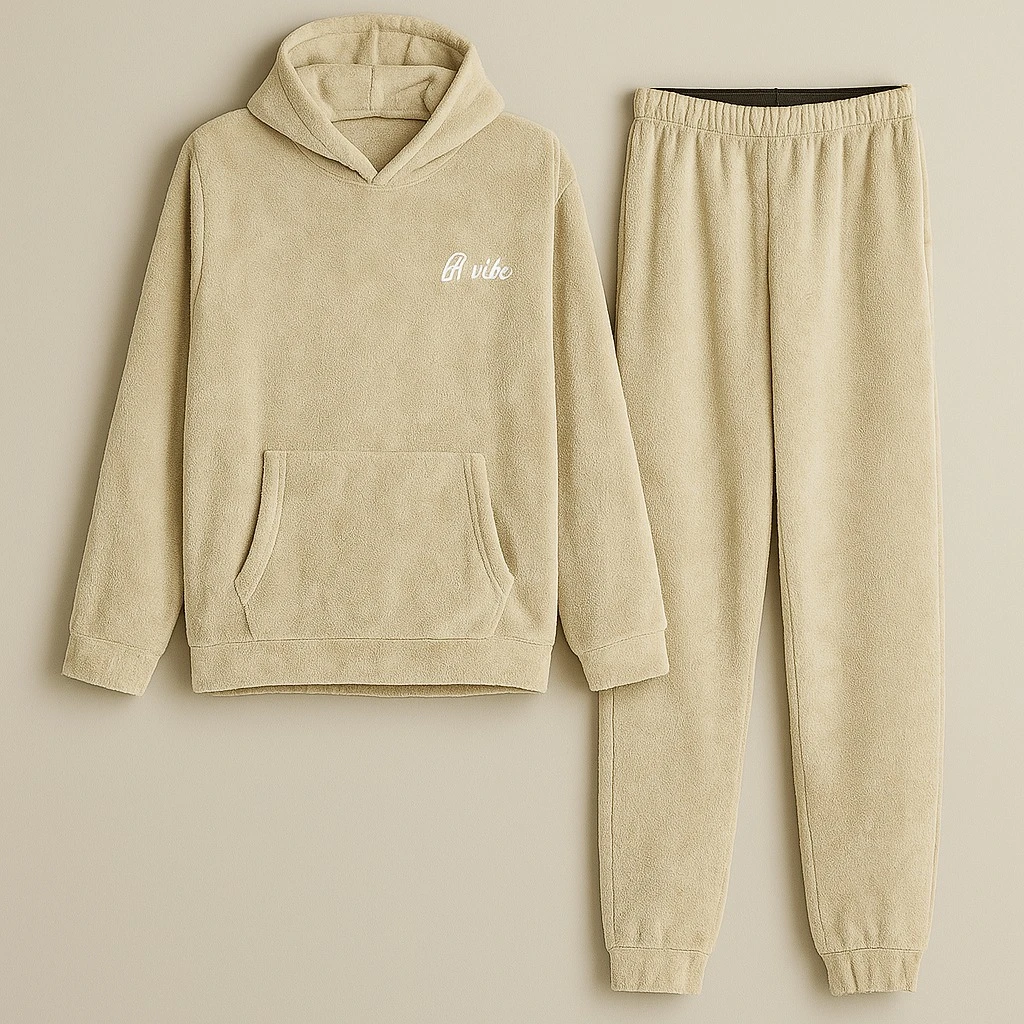 بيجامة نسائية فرو شتوية بلون بيج ناعم، تتكوّن من هودي بقبعة وجيب أمامي وبنطال بخصر مطاطي، خامة فرو ناعمة تمنح دفء وراحة عالية، مثالية للبيت والأجواء الباردة.