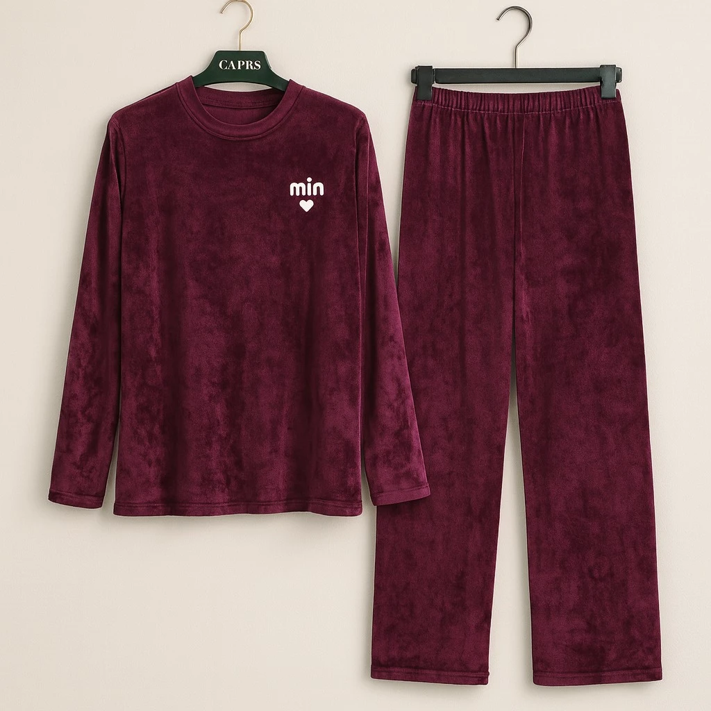 بيجامة نسائية مخمل شتوية بلون خمري فاخر، خامة ناعمة ودافئة، تصميم بسيط بدون نقوش، أكمام طويلة وبنطال واسع بخصر مطاطي مريح، مثالية للراحة في البيت خلال الأجواء الباردة.
