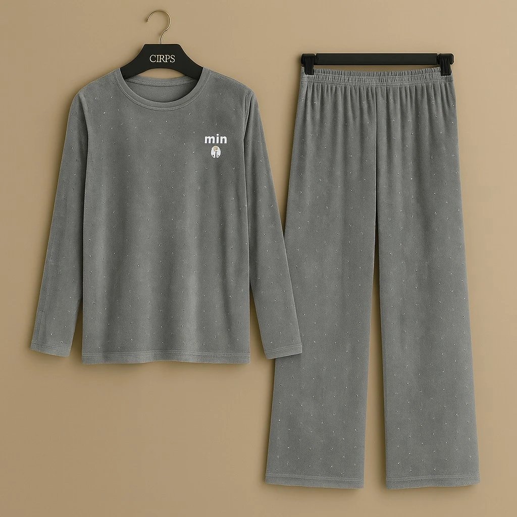 بيجامة نسائية مخمل شتوية بلون رمادي أنيق، تصميم مرقّط ناعم، خامة ناعمة ودافئة، أكمام طويلة وبنطال واسع بخصر مطاطي، مثالية للراحة والدفء في المنزل خلال الشتاء.