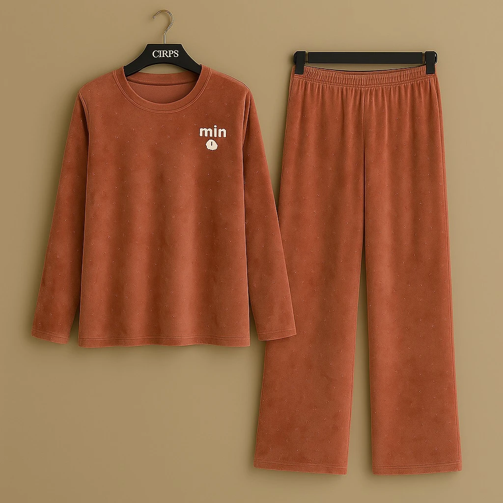 بيجامة نسائية مخمل شتوية بلون طوبي دافئ، تصميم بسيط مع نقاط ناعمة، قماش مخملي ناعم ومريح، أكمام طويلة وبنطال واسع بخصر مطاطي، مثالية للراحة في المنزل خلال الأجواء الباردة.