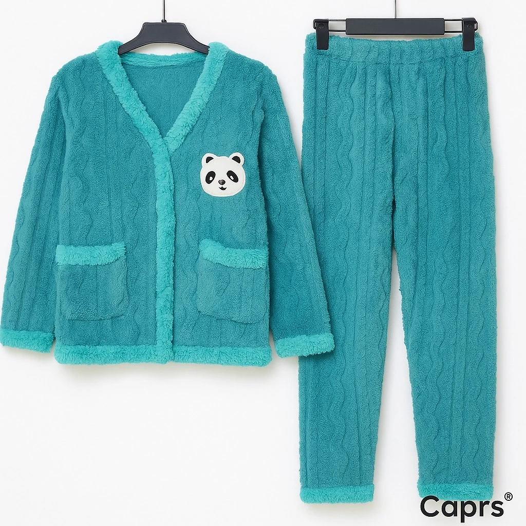 بيجامة نسائية شتوية ناعمة بلون أزرق تركوازي بتصميم باندا لطيف، مصنوعة من قماش مخملي دافئ يمنحك راحة ودفئًا مثاليًا. مزودة بجيوب عملية وتفاصيل ناعمة على الحواف لإطلالة منزلية أنيقة ومريحة.