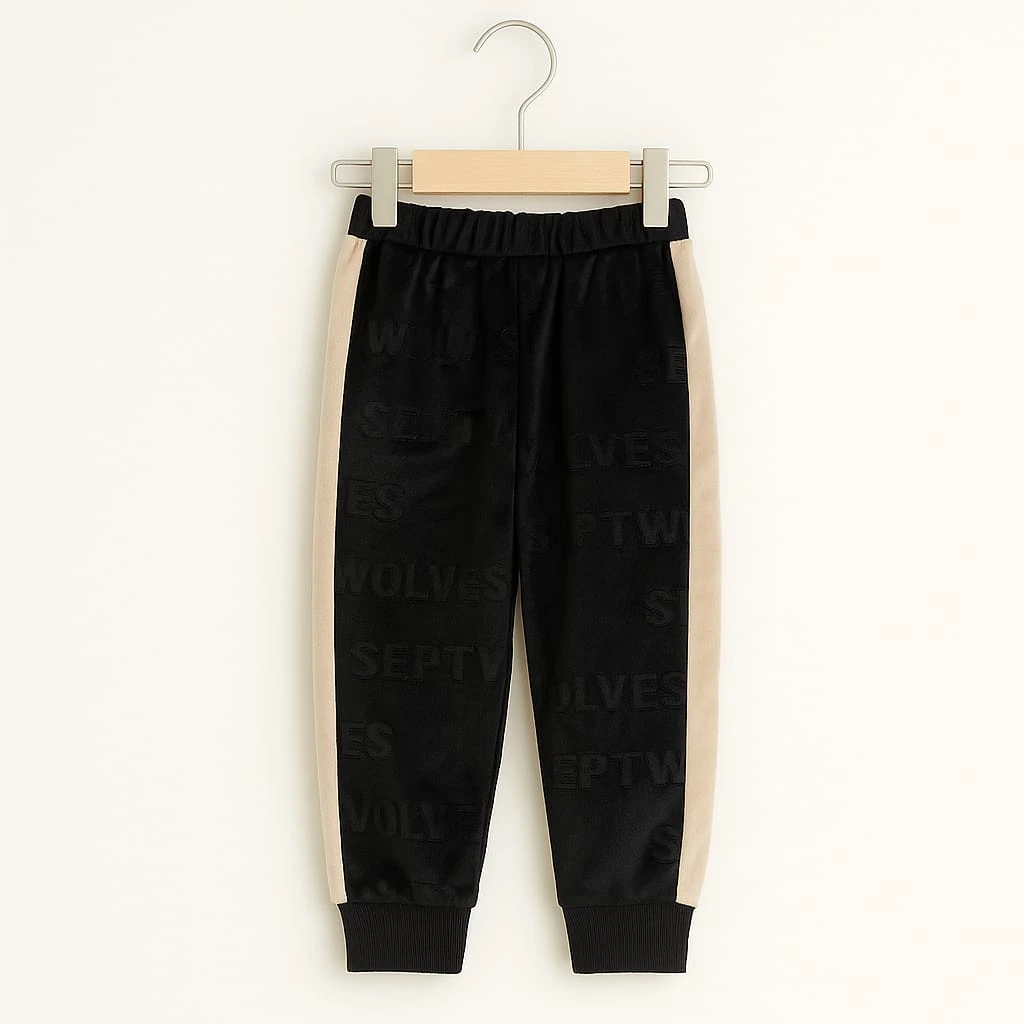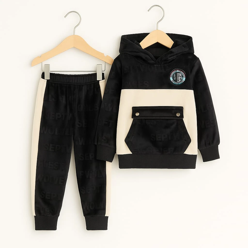 يتكون من هودي بقبعة بتصميم رياضي باللون الأسود مع لمسات كريمية وشعار جانبي مميز، بالإضافة إلى بنطال بلون مطابق بأطراف مطاطية لتوفير حرية الحركة.