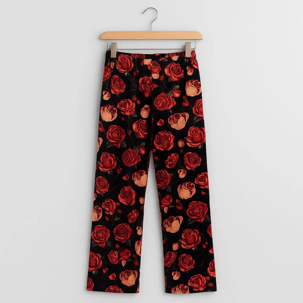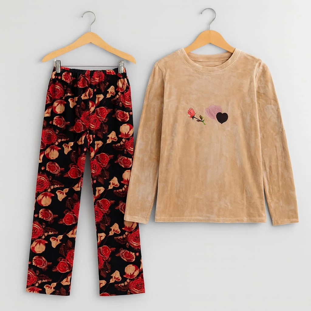 بيجامة بنية ناعمة مع سروال بطبعة ورود حمراء فخمة، تمنحك إطلالة أنثوية راقية في المنزل.