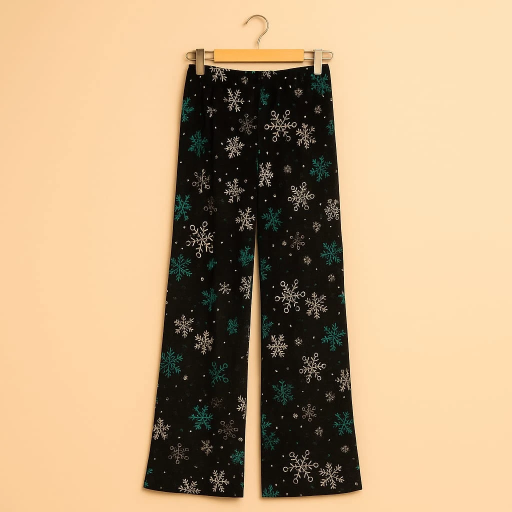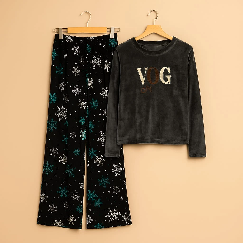 بيجامة شتوية أنيقة بلون رمادي داكن، مزينة بطبعات رقاقات الثلج باللونين الأزرق والأبيض. قماشها المخملي الناعم يمنح دفئًا وراحة مثالية لأمسيات الشتاء الباردة