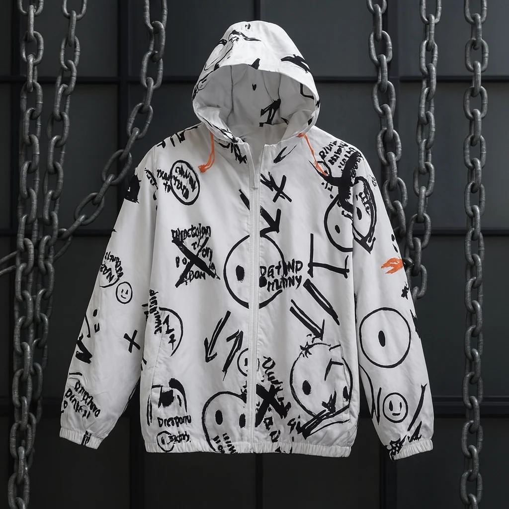 جاكيت خفيف عصري باللون الأبيض مزين بطبعات جرافيكية عشوائية باللونين الأسود والبرتقالي لإطلالة شبابية جريئة ولافتة. يتميز بخامة خفيفة ومريحة مناسبة للأجواء المعتدلة، مع تصميم بسحاب أمامي يسهل الارتداء وغطاء رأس عملي يوفر حماية إضافية من الرياح. الأكمام مزودة بأطراف مطاطية لضمان ثبات أفضل وراحة أثناء الحركة. مثالي للإطلالات اليومية أو الرياضية ويضفي لمسة من الحيوية والأناقة العصرية على أي تنسيق.