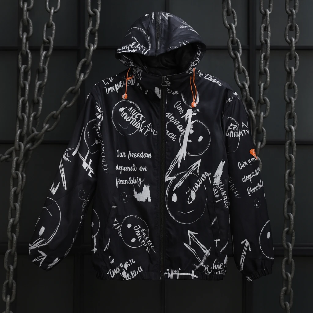 جاكيت خفيف عصري بلون أسود أنيق مزين بطبعات جرافيكية بيضاء ولافتات فنية تمنحه مظهراً جريئاً ومواكباً للموضة. يتميز بخامة خفيفة ومريحة مثالية للأجواء المعتدلة، مع سحاب أمامي للإغلاق السهل وغطاء رأس مزود بخيوط برتقالية تضيف لمسة حيوية. تصميم الأكمام والأطراف المطاطية يوفر راحة وثباتاً أثناء الارتداء. خيار مثالي للشباب الباحثين عن إطلالة كاجوال مميزة تجمع بين الأناقة والراحة في أجواء الخريف أو الربيع.