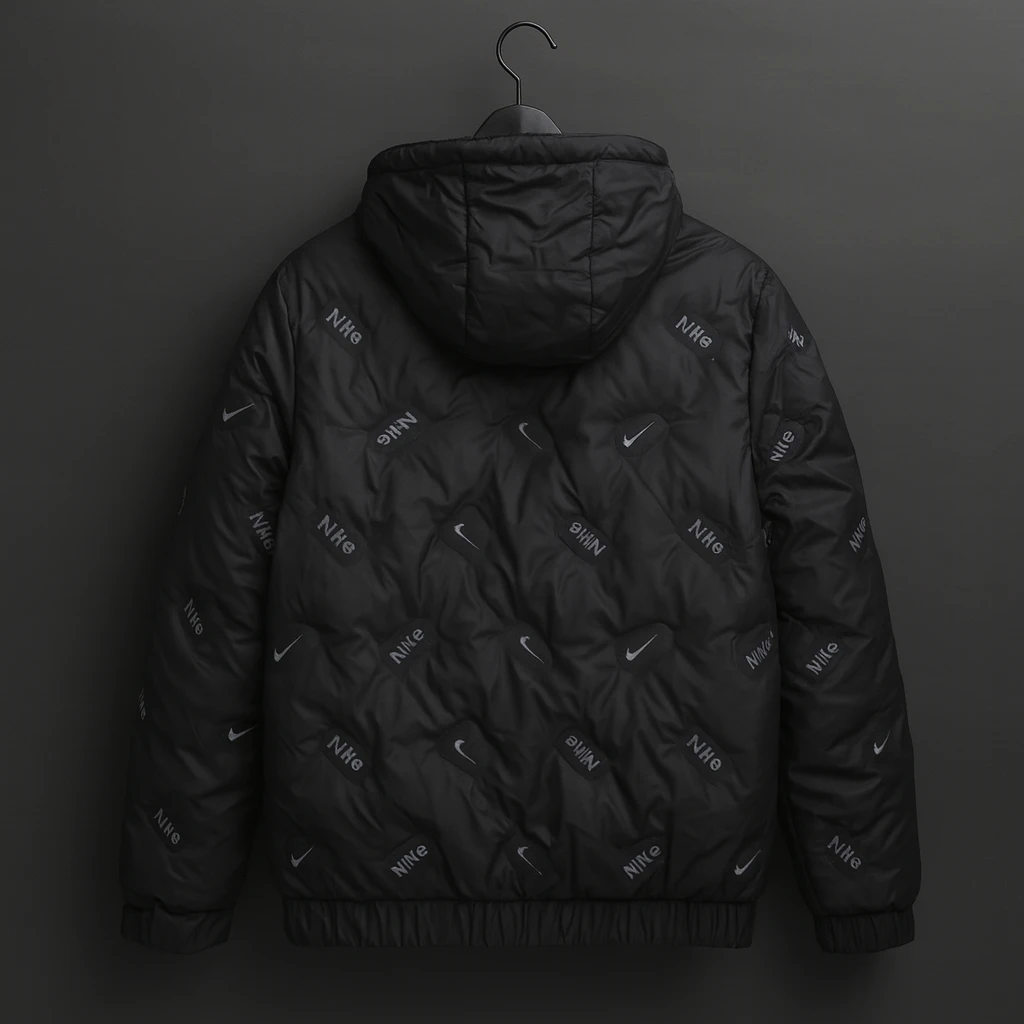 نقوش شعار Nike المنتشرة على كامل الجاكيت تمنحه لمسة رياضية فخمة وعصرية، باللون الأسود الأحادي الذي يناسب مختلف الإطلالات الشتوية.