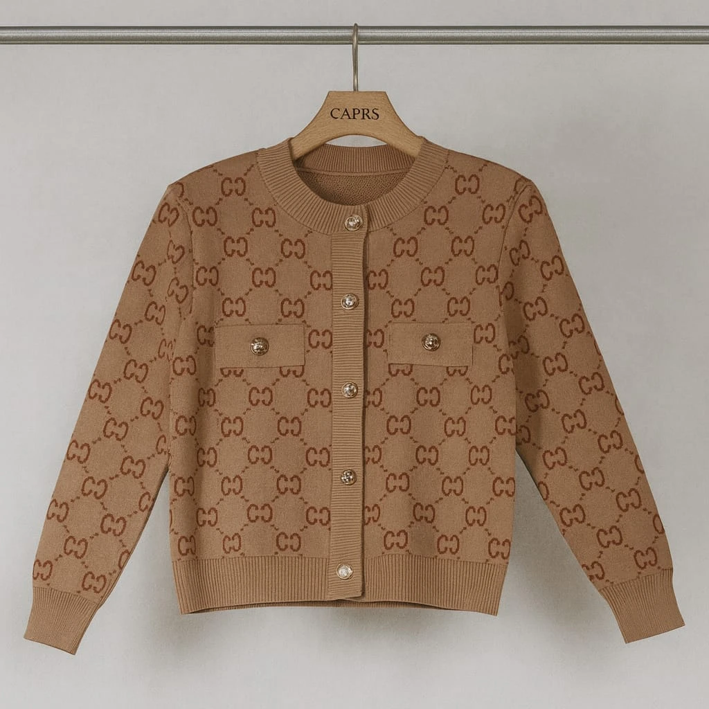 جاكيت نسائي أنيق بلون بيج مزين بنقوش متكررة تضفي لمسة فاخرة وعصرية، مع أزرار ذهبية وجيوب أمامية تضيف تفاصيل راقية. مصنوع من خامة دافئة وناعمة، مثالي لإطلالة أنثوية أنيقة في الأيام الباردة.