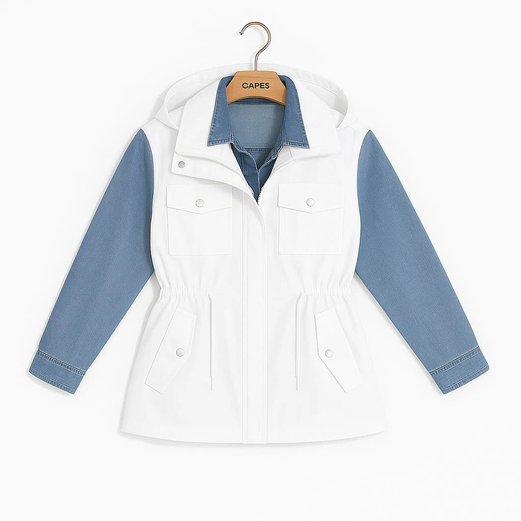 جاكيت نسائي أنيق بتصميم عصري يجمع بين اللونين الأبيض الكلاسيكي والأزرق الجينزي لإطلالة شبابية جذابة.