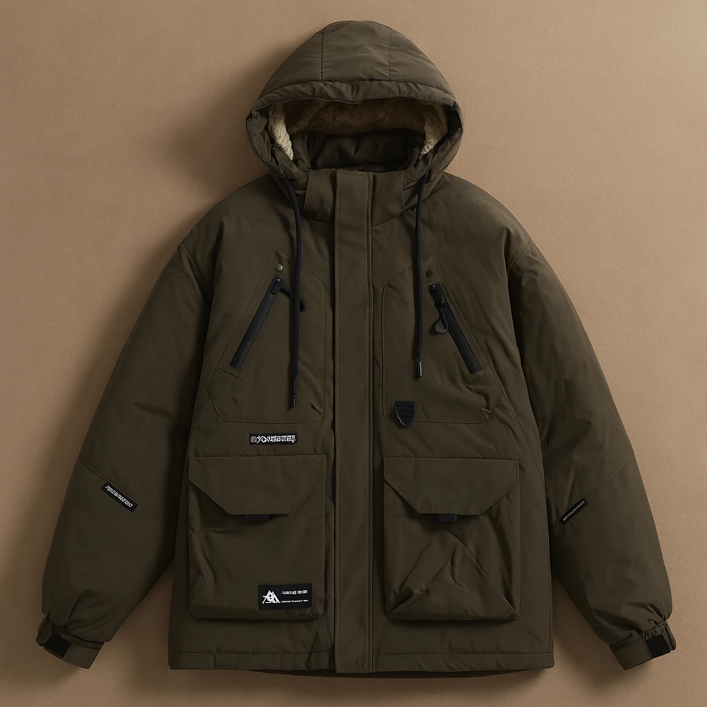 يتميز الجاكيت بغطاء رأس (هودي) قابل للشد بخيوط متينة، وسحّاب أمامي مغلق بإحكام، إضافة إلى عدة جيوب أمامية بسحّابات وغطاء قلاب لتوفير مساحة تخزين عملية ومظهر مميز.