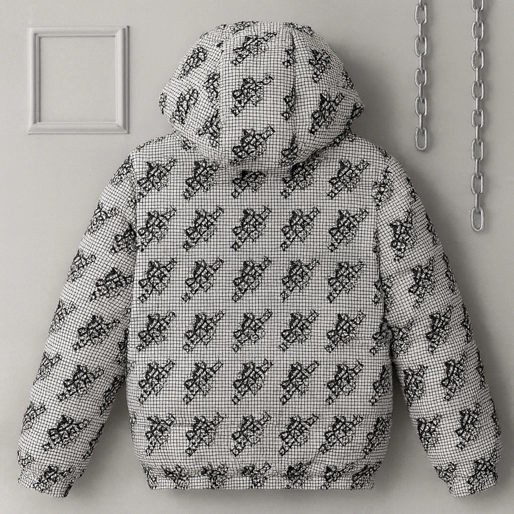 جاكيت شتوي فخم بحشوة ريش خفيفة بتصميم مميز يجمع بين الأناقة والدفء. يتميز بنقشة فنية جذابة بالأبيض والأسود تضفي لمسة عصرية فريدة، مع خامة ناعمة تمنح راحة ودفئًا عاليين. يأتي بقبعة عملية وسحاب أمامي متين، بالإضافة إلى جيوب جانبية عملية.