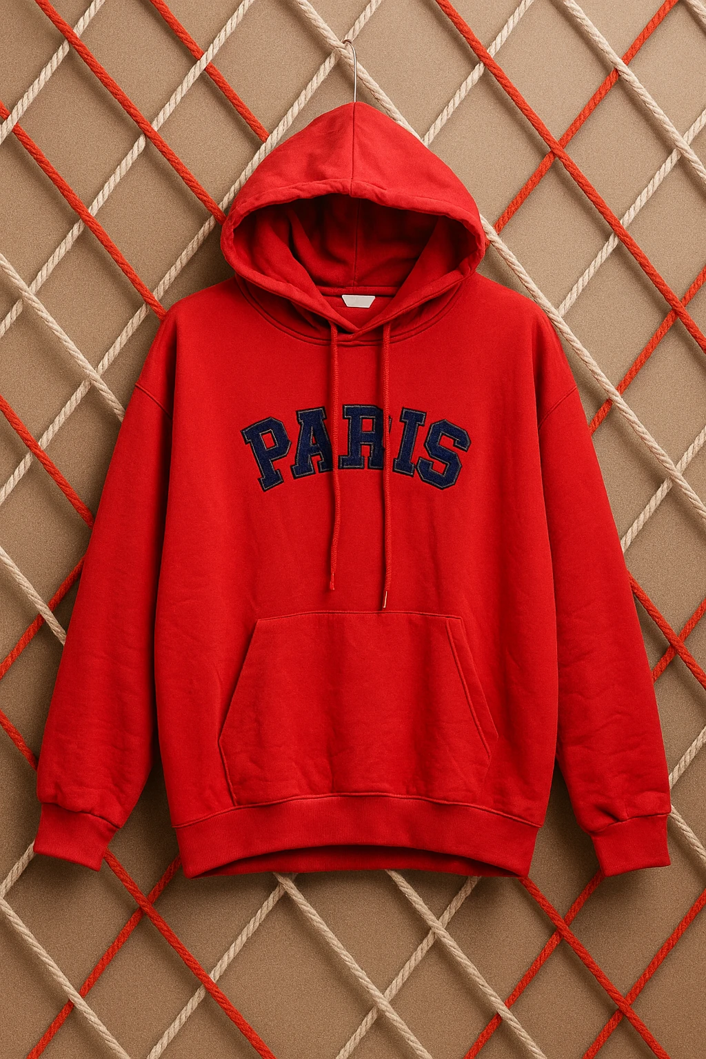 هودي قطن أنيق بلون أحمر جريء يحمل كلمة PARIS مطبوعة بخط كبير باللون الكحلي لمظهر شبابي ملفت.