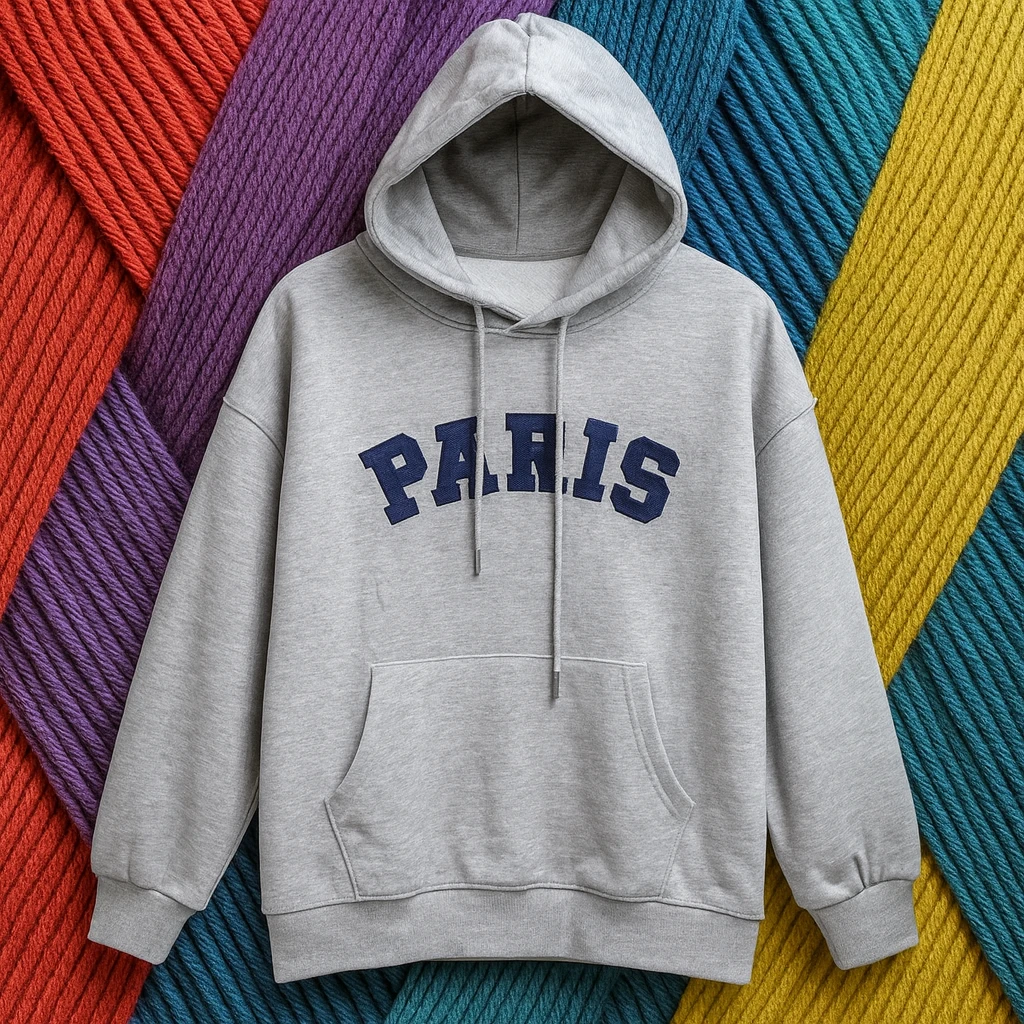 هودي قطن بلون رمادي فاتح بتصميم بسيط وعصري يحمل كلمة PARIS مطبوعة بخط كبير باللون الكحلي.