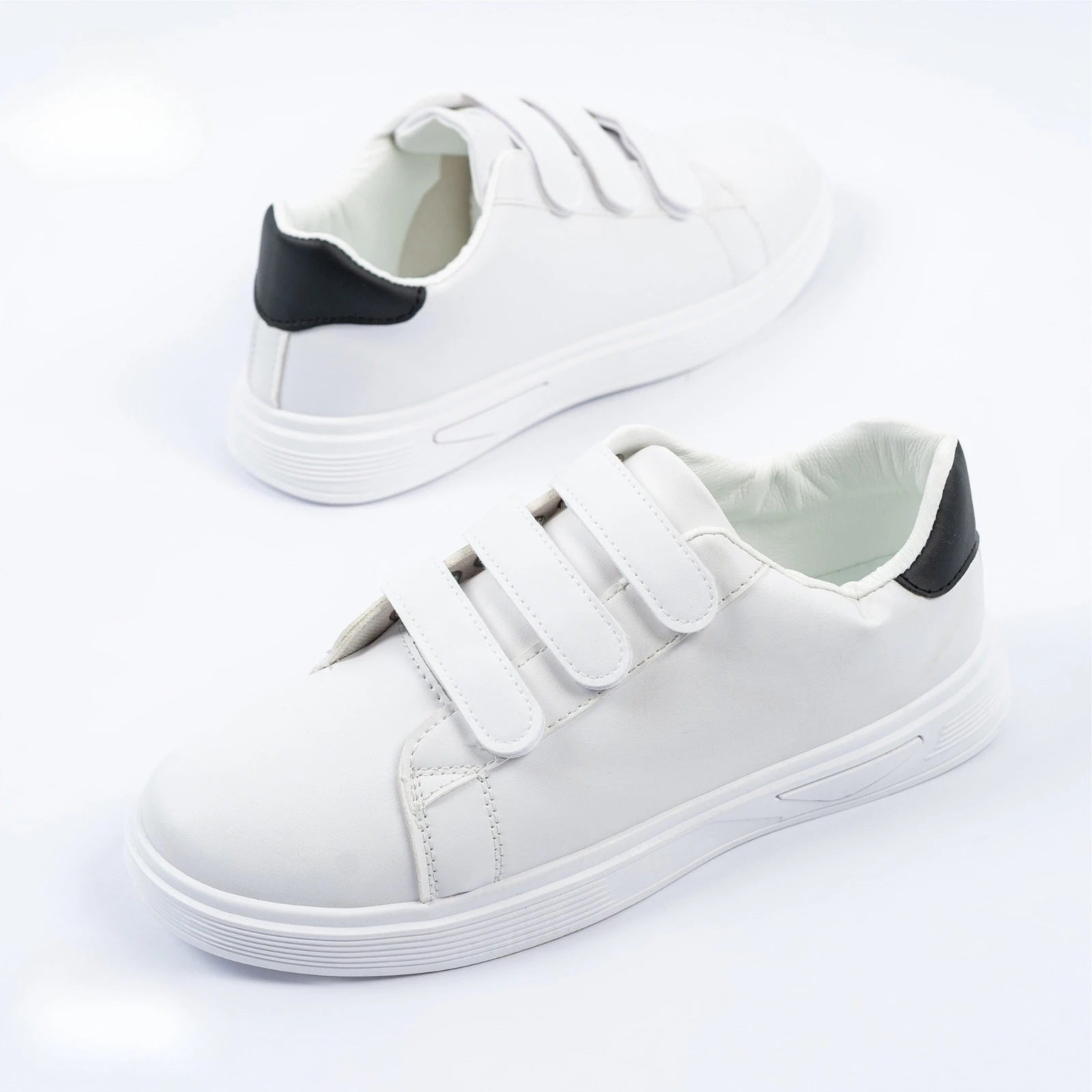 حذاء رياضي أبيض بتصميم عصري ومريح، مزود بثلاثة أشرطة لاصقة لسهولة الارتداء والخلع. مصنوع من خامات عالية الجودة تمنح القدم راحة وثباتاً أثناء الحركة، مع لمسة خلفية باللون الأسود تضيف مظهراً أنيقاً يناسب الإطلالات اليومية والكاجوال.