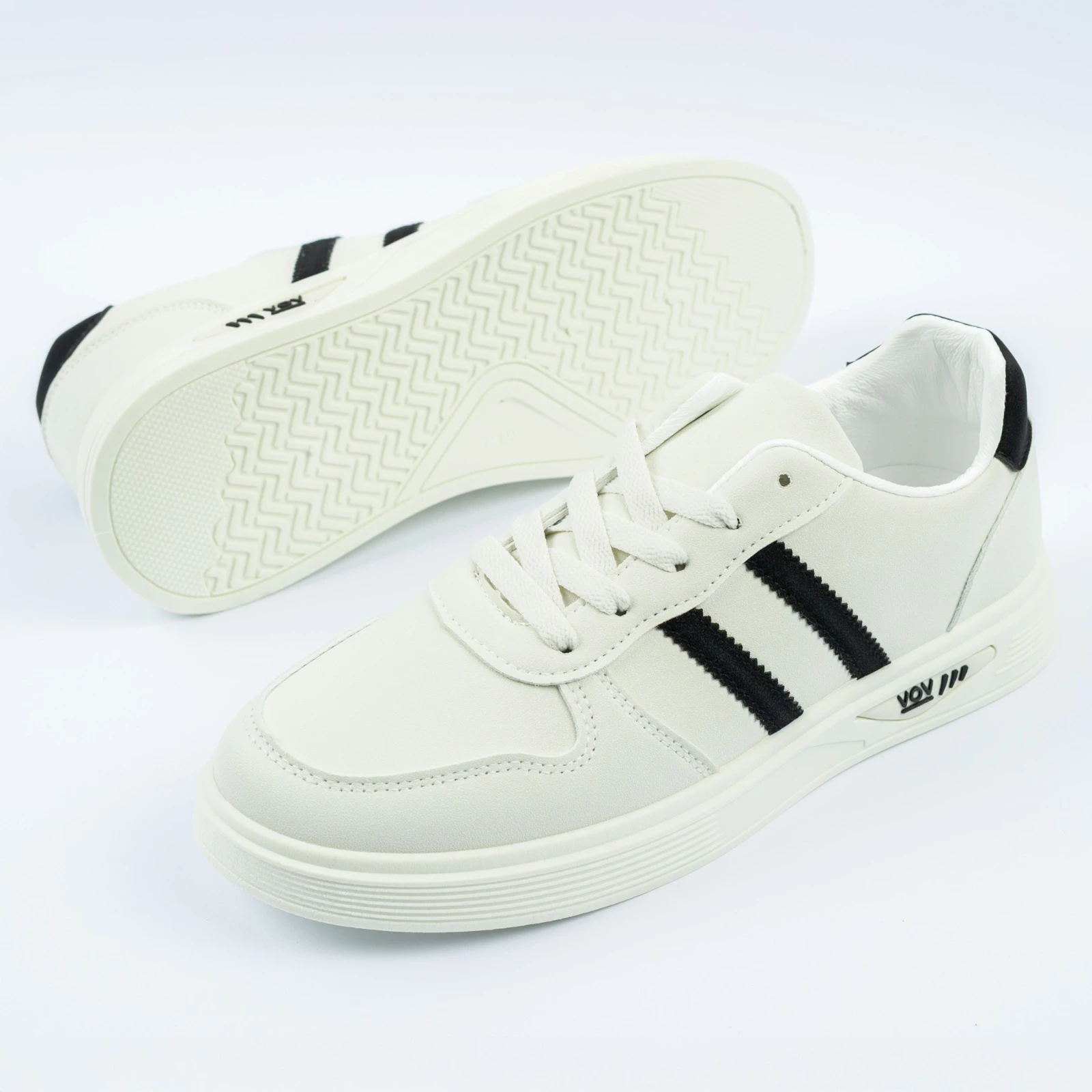 حذاء شبابي أنيق باللون الأبيض مزين بخطين جانبيين باللون الأسود يمنحانه لمسة عصرية جذابة. مصنوع من خامة مريحة وخفيفة توفر ثباتًا وراحة أثناء المشي، مع نعل قوي مقاوم للانزلاق. مثالي للإطلالات اليومية الكاجوال أو الرياضية الخفيفة.