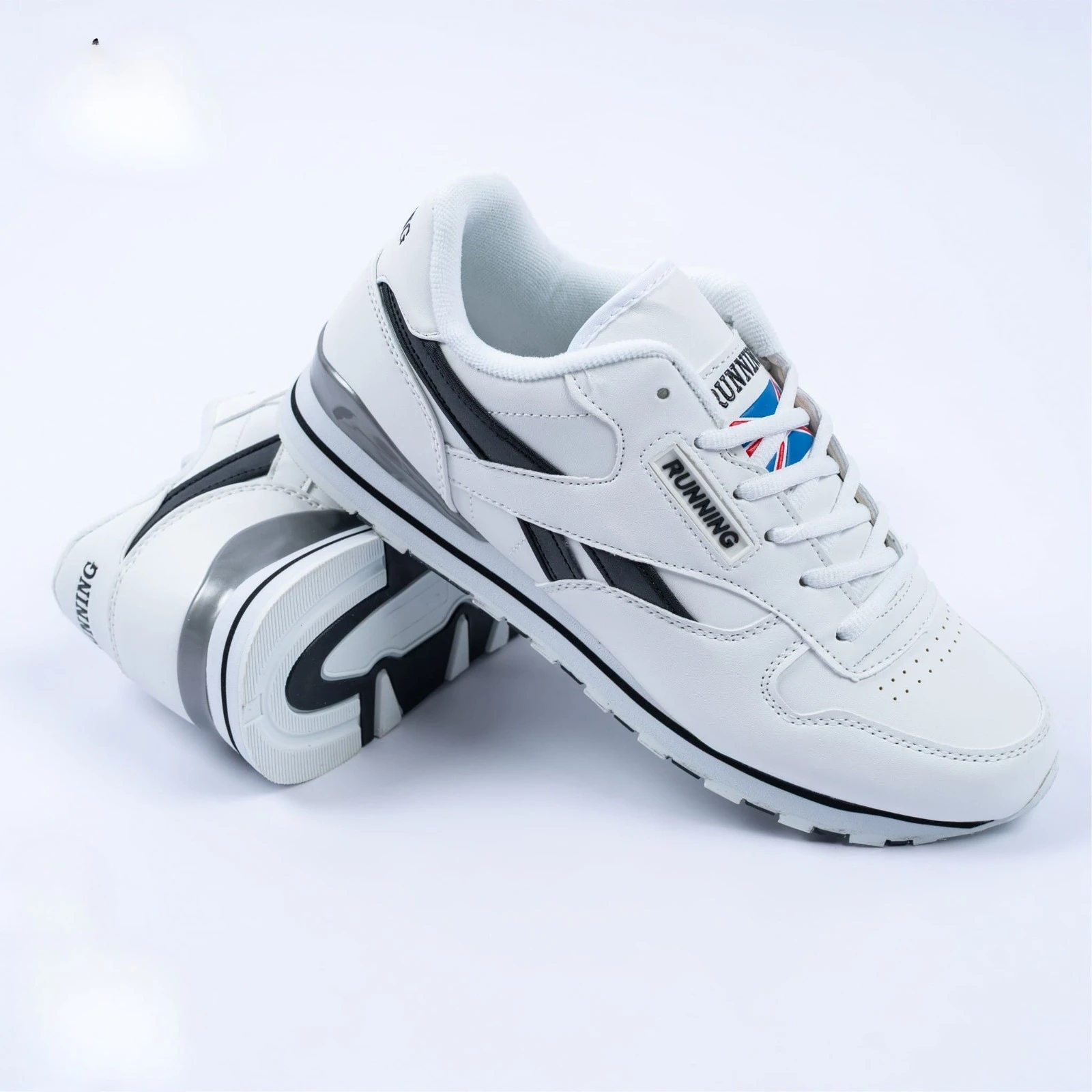 حذاء رياضي أنيق باللون الأبيض مع خطوط جانبية سوداء تضيف لمسة عصرية مميزة. مصنوع من خامة متينة وخفيفة الوزن تمنح راحة أثناء الحركة، مع نعل مطاطي مانع للانزلاق يوفر ثباتاً ممتازاً. مثالي للجري، التمارين، أو الإطلالات اليومية الكاجوال.
