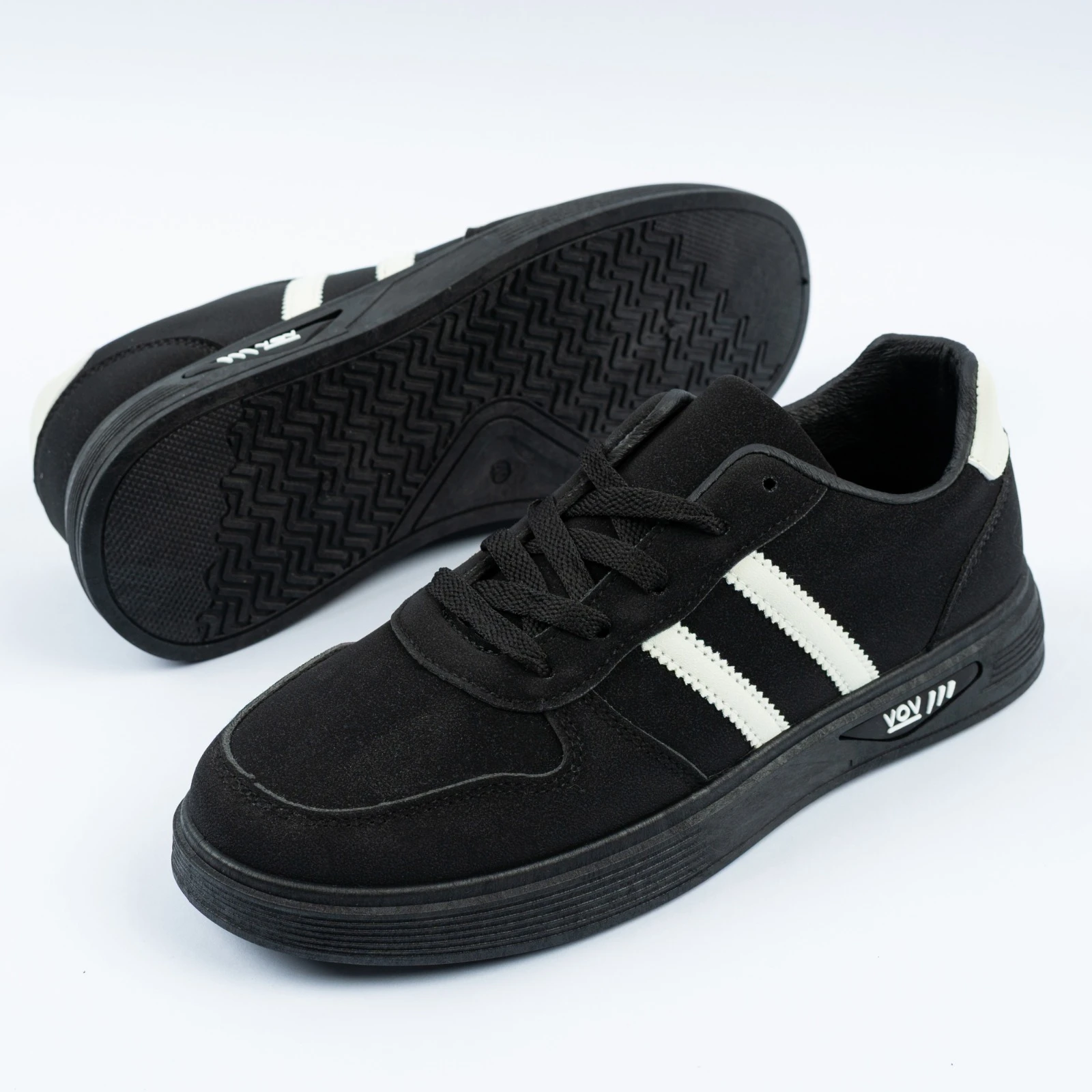 حذاء شبابي أنيق باللون الأسود مزين بخطين جانبيين أبيضين يمنحانه مظهرًا عصريًا ملفتًا. مصنوع من خامة مريحة ومتينة مع نعل قوي مقاوم للانزلاق يوفر ثباتًا وراحة طوال اليوم. مثالي للإطلالات الكاجوال والرياضية اليومية.