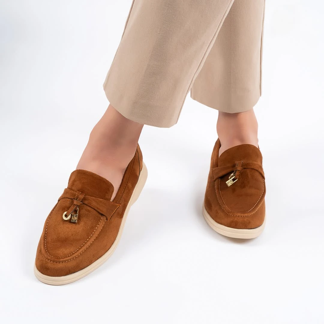 حذاء نسائي أنيق باللون البني بتصميم مخملي فاخر ولمسة عصرية جذابة. يتميز بفيونكة صغيرة مع تفصيل معدني ذهبي، ونعل مريح خفيف يوفر ثباتاً وراحة مثالية للمشي اليومي والمناسبات الكاجوال.