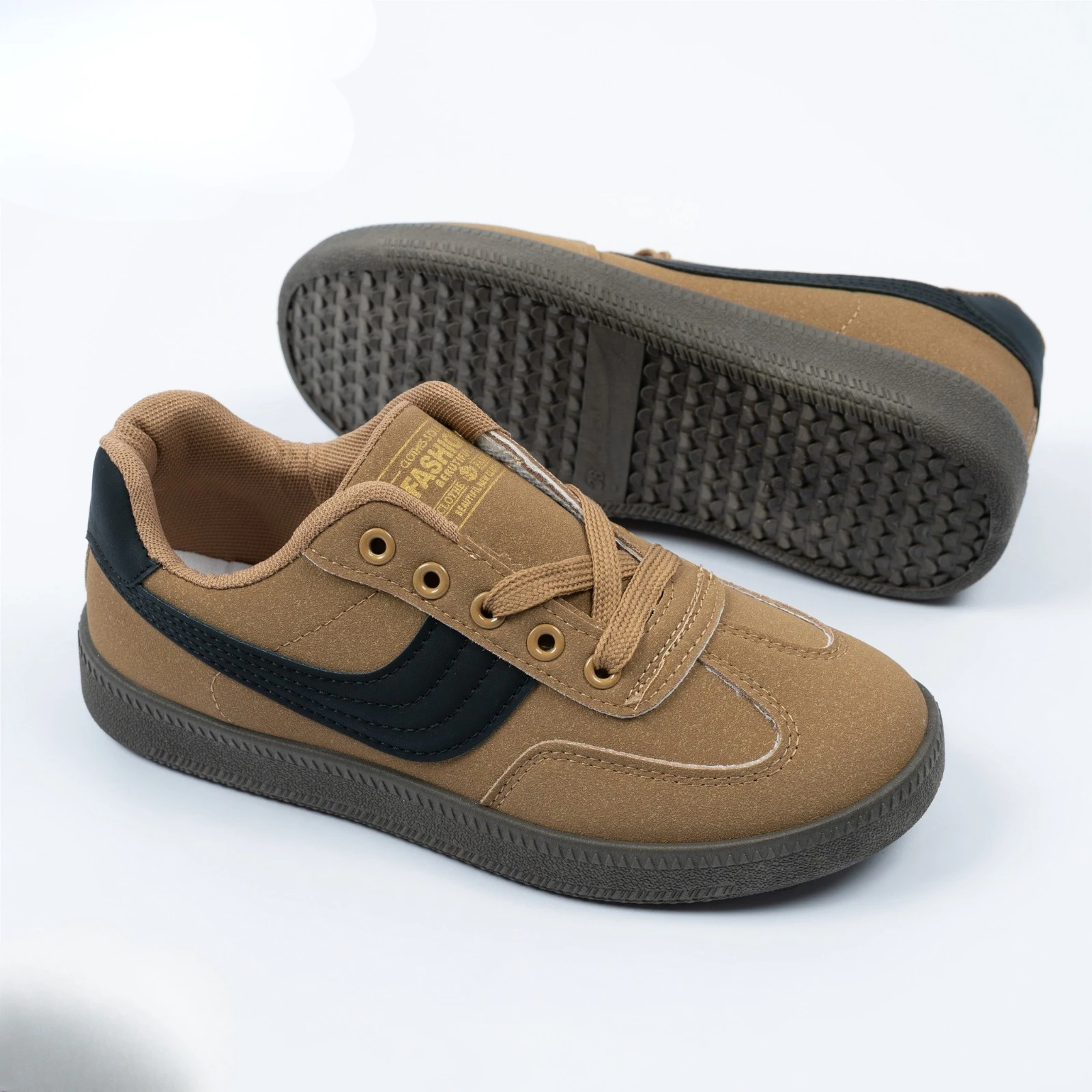 حذاء رياضي باللون البني مع خطوط جانبية سوداء تمنحه مظهراً عصرياً مميزاً. مصنوع من خامات متينة وخفيفة توفر راحة أثناء المشي، مع نعل مطاطي مقاوم للانزلاق. مثالي للاستخدام اليومي والمدرسي ولمحبي الإطلالة الكاجوال الأنيقة