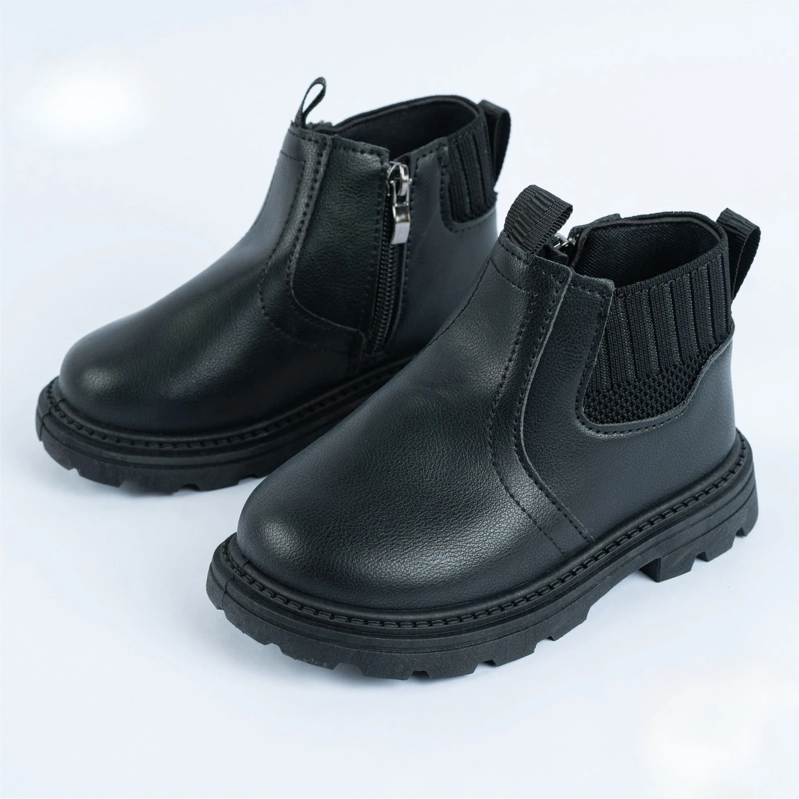 حذاء بوت عصري للأطفال باللون الأسود، تصميم مريح وسهل الارتداء، مثالي للأيام الباردة والمناسبات اليومية.