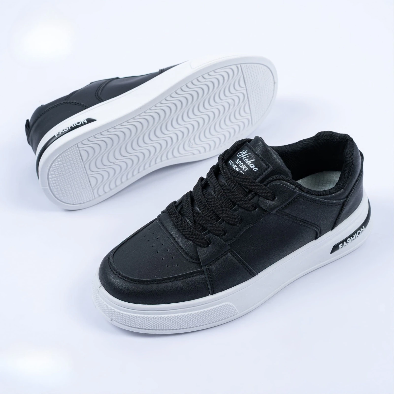 حذاء كاجوال أنيق باللون الأسود مع نعل أبيض يمنحك مظهراً عصرياً يناسب الإطلالات اليومية. مصنوع من خامة مريحة عالية الجودة مع أربطة متينة ونعل مطاطي مقاوم للانزلاق. مثالي للمشي والسفر والاستخدام اليومي بأناقة وراحة.