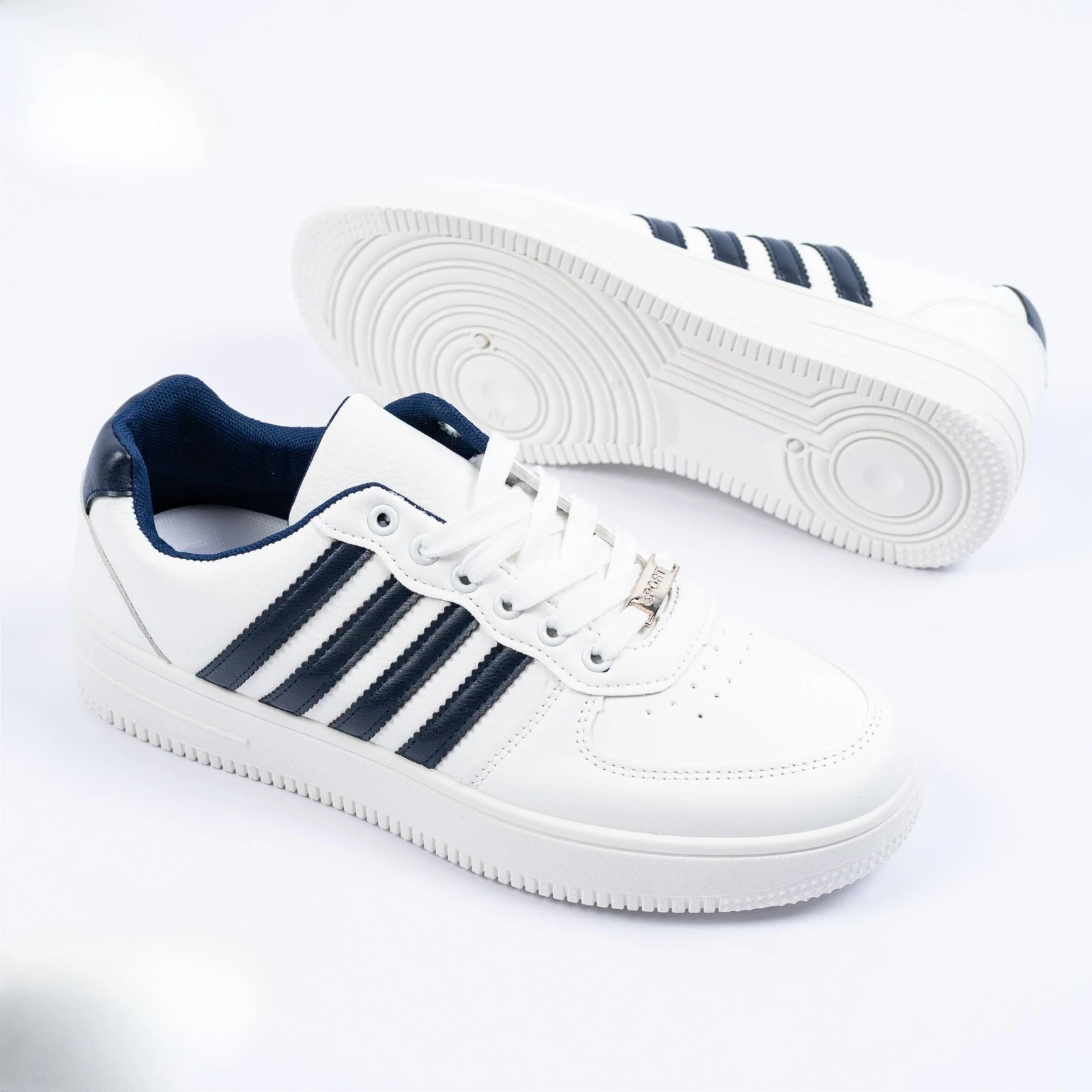 حذاء كاجوال عصري باللون الأبيض مع خطوط جانبية زرقاء داكنة تضيف لمسة أنيقة. يتميز بخامة مريحة ونعل مطاطي خفيف يوفر ثباتاً وراحة أثناء المشي. مناسب للإطلالات اليومية، الجامعة أو الخروج مع الأصدقاء بأسلوب شبابي أنيق ومريح.