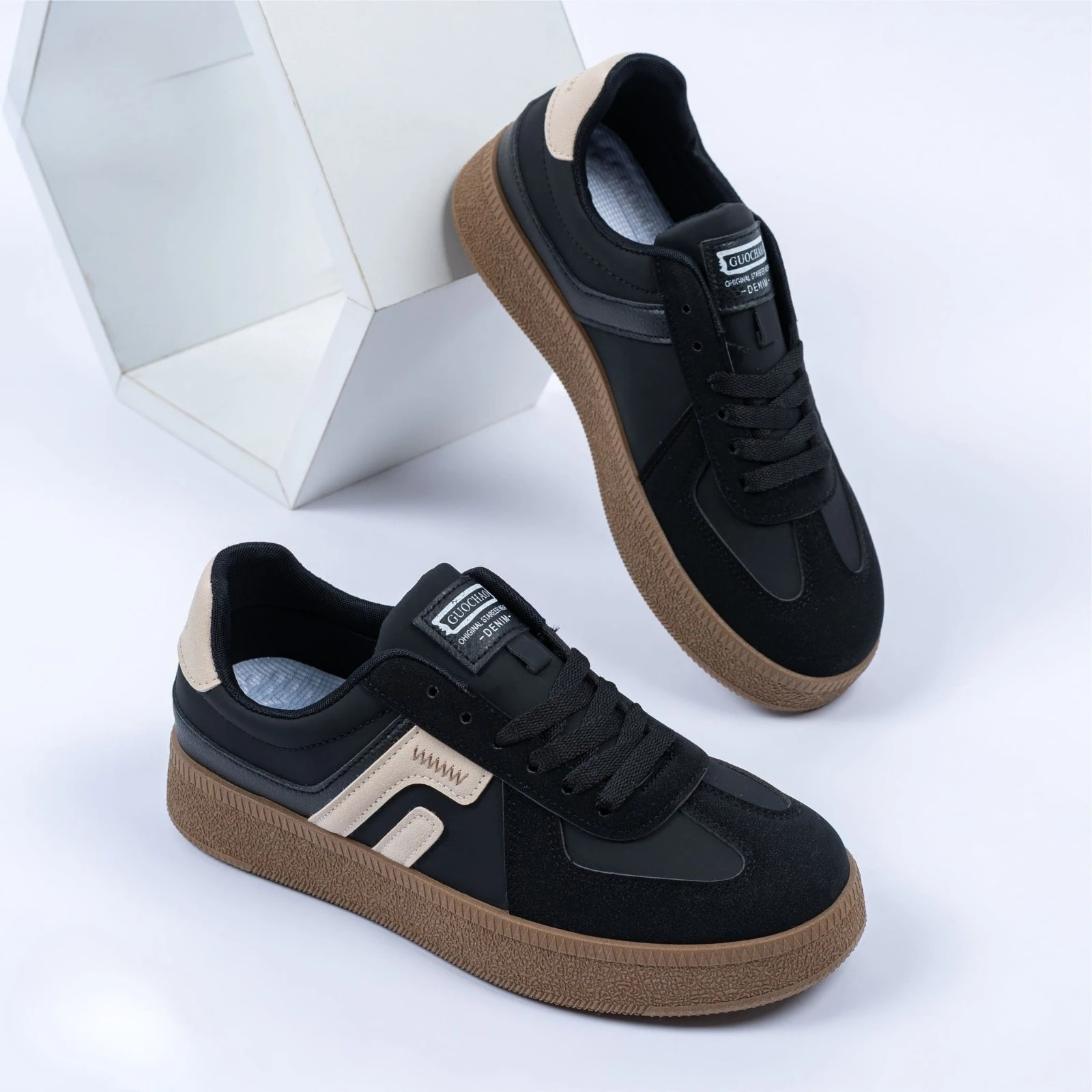 حذاء رجالي بتصميم كاجوال أنيق باللون الأسود مع تفاصيل بيج ونعل بني متين، يمنح مظهرًا عصريًا وراحة فائقة أثناء الاستخدام اليومي. مثالي للإطلالات الشبابية والمناسبات غير الرسمية.